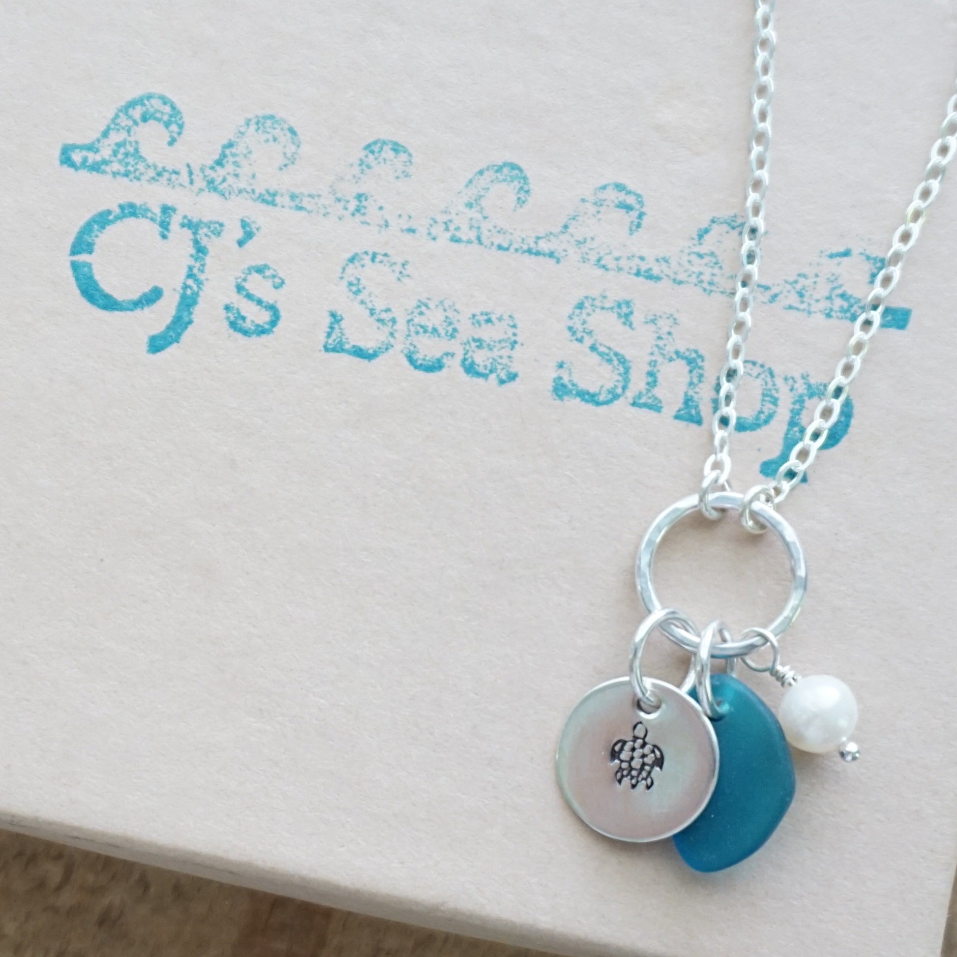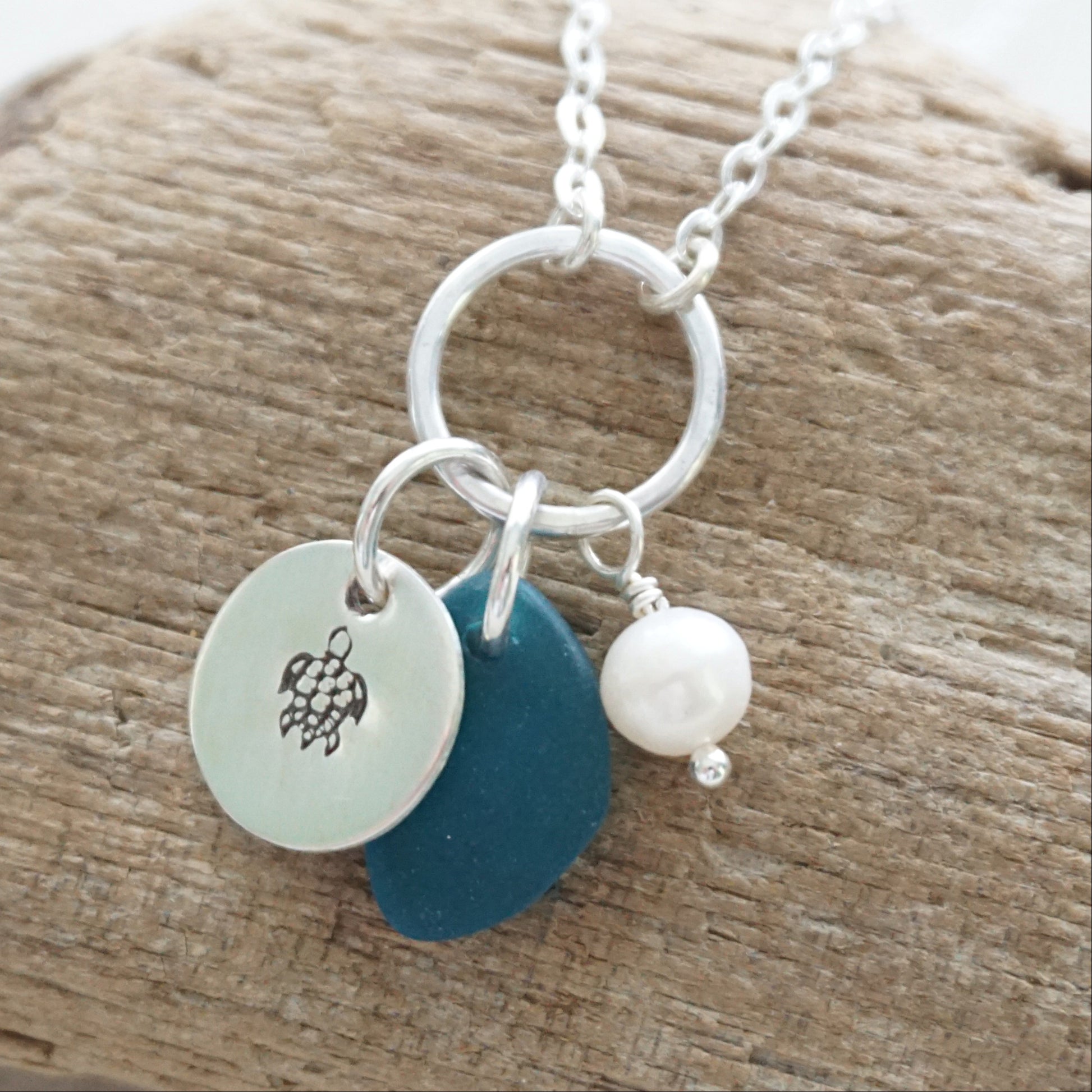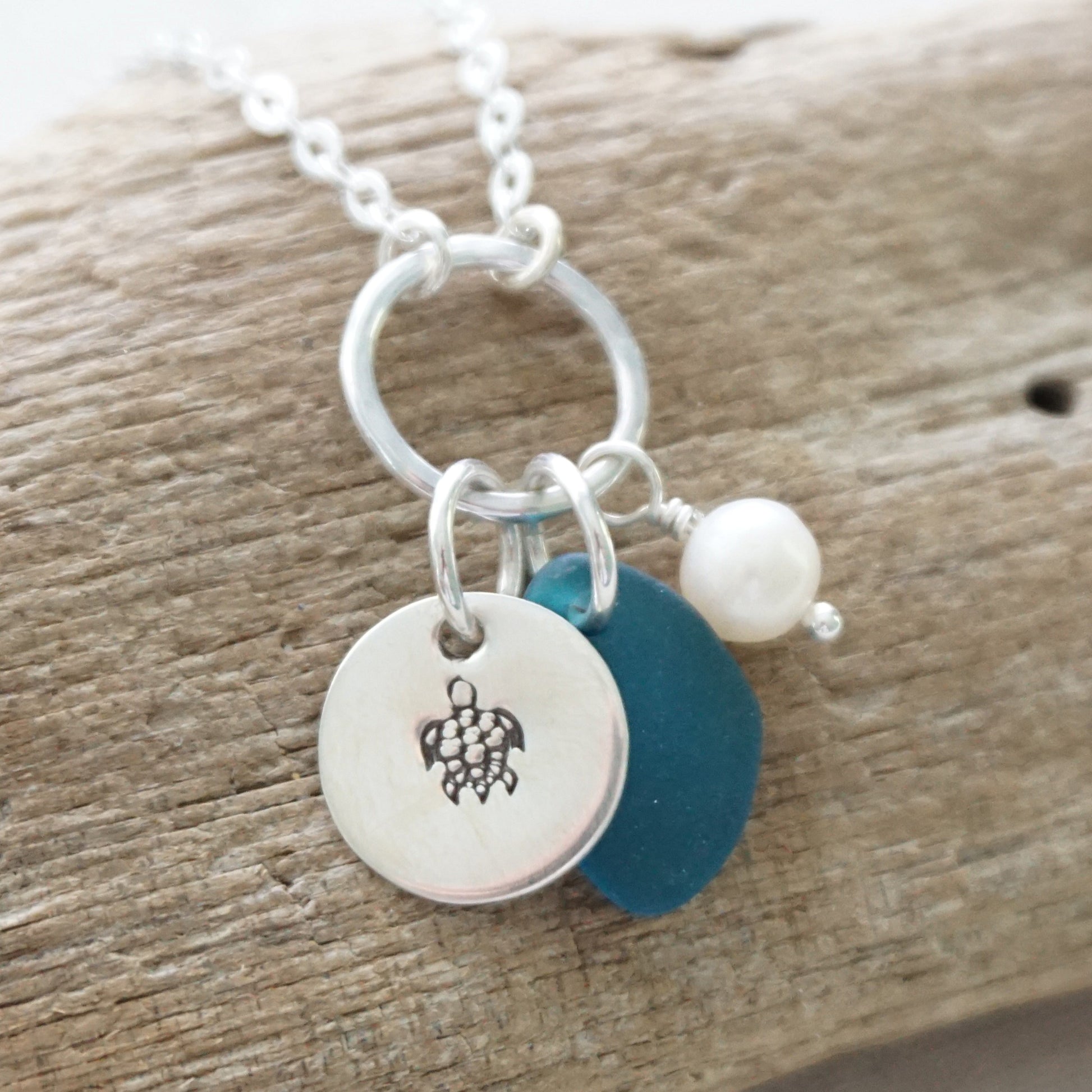 Hand Stamped Turtle Charm Necklace with Sea Glass and Freshwater Pearl