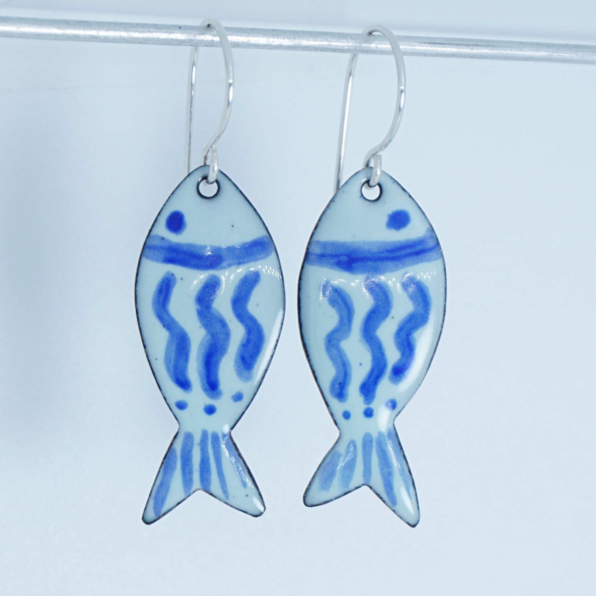 To create these earrings, I hand cut, file, and shape each fish, then fire lead free vitreous enamel in a kiln to over 1500°. While firing, the enamel fuses to the copper. Multiple layers and firings are necessary to achieve the look of these earrings.
