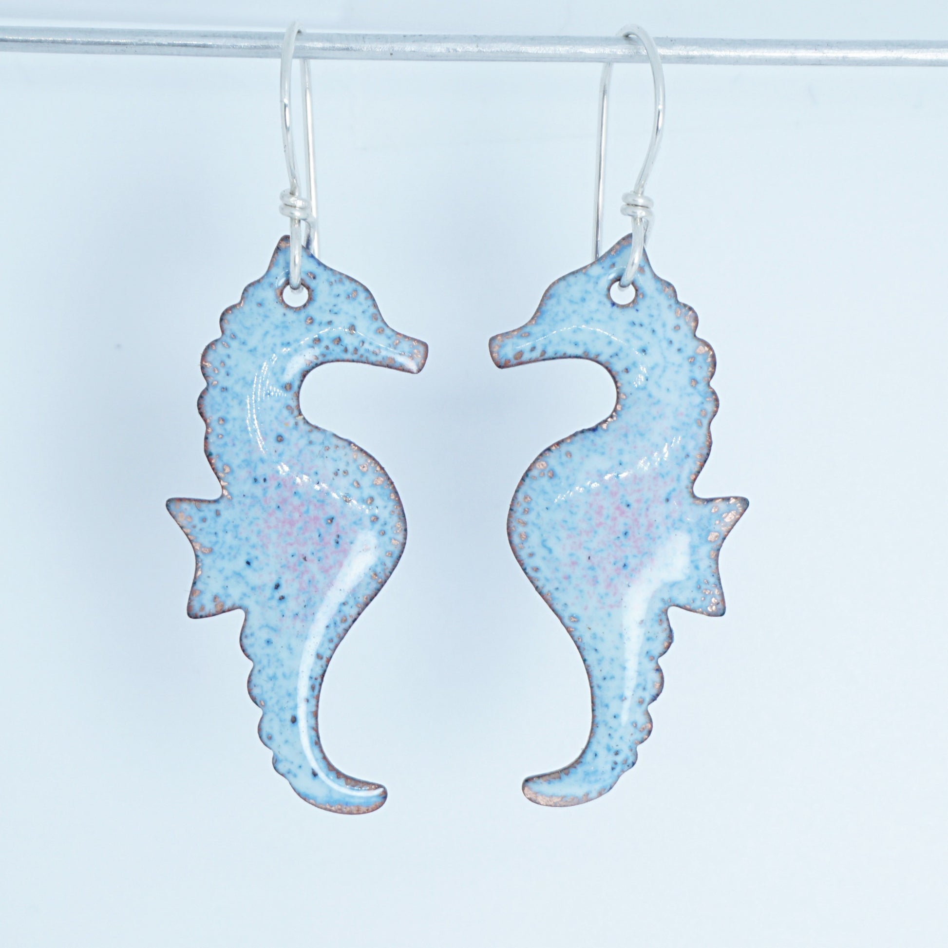 Light seafoam green and blue with a little bit of pink enamel seahorse statement earrings. I use a separation technique to achieve the look of these earrings.