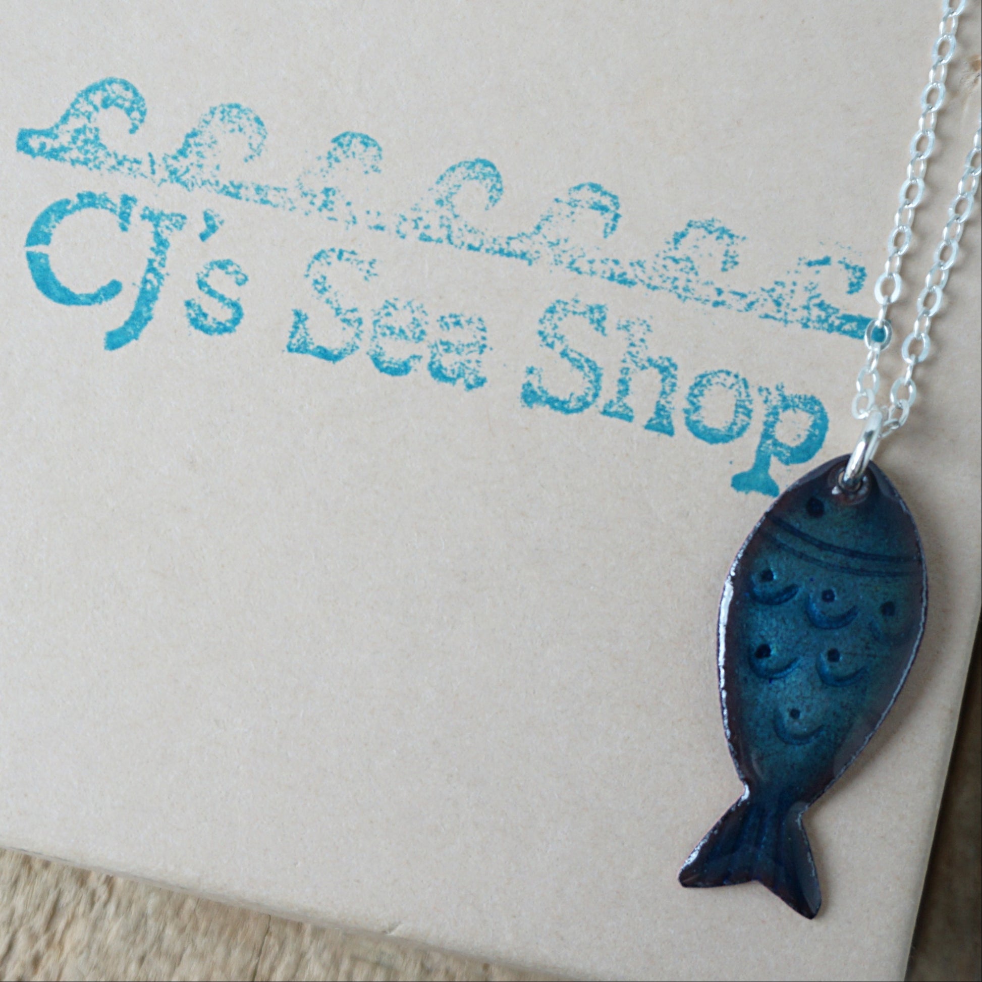 Metallic blue enamel fish pendant. This pendant is hand stamped copper, with transparent enamel fired on top to show the design below.