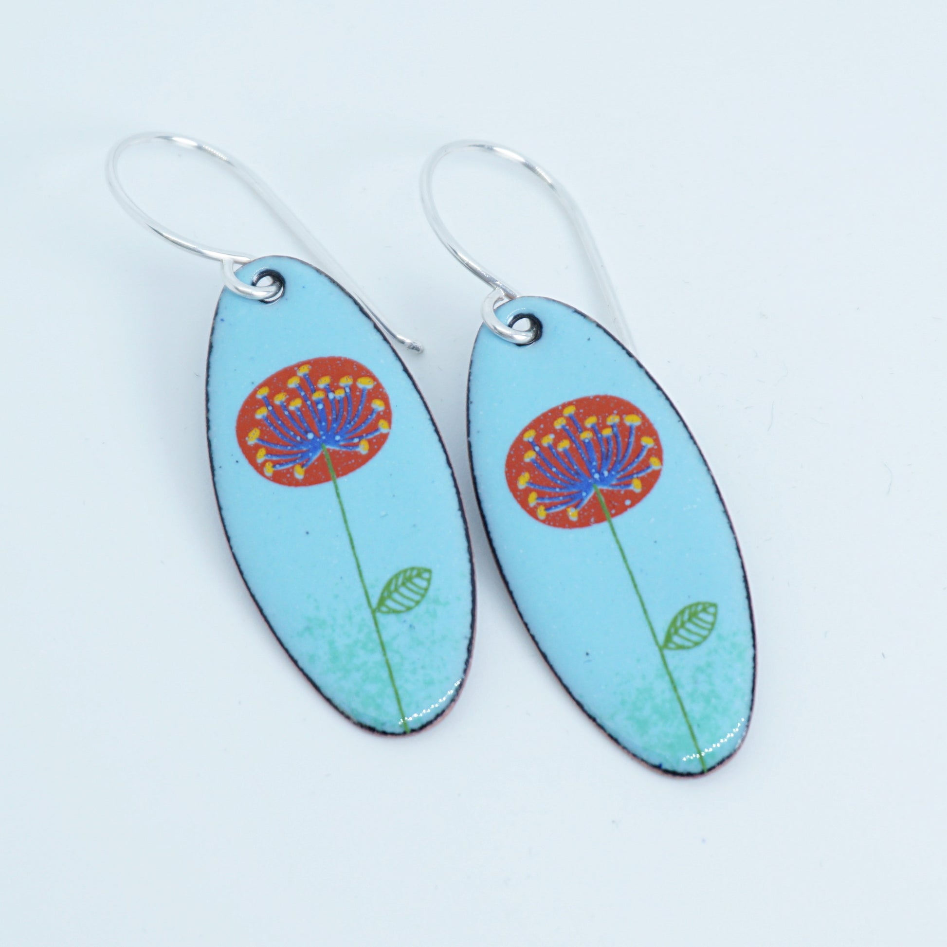 CLEARANCE Red and Blue Dandelions on Light Blue Oval Earrings