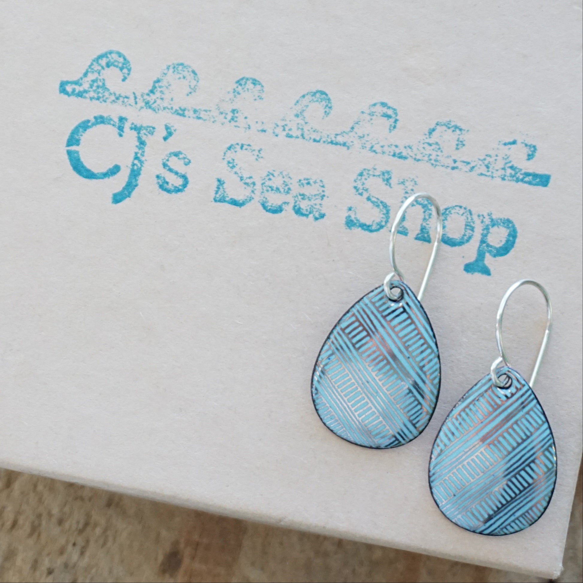 Silver accents on light blue enamel teardrop earrings.