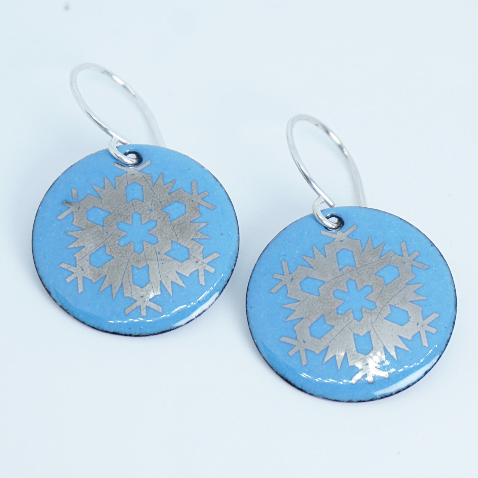 Silver Snowflakes on Blue Enamel Disc Earrings