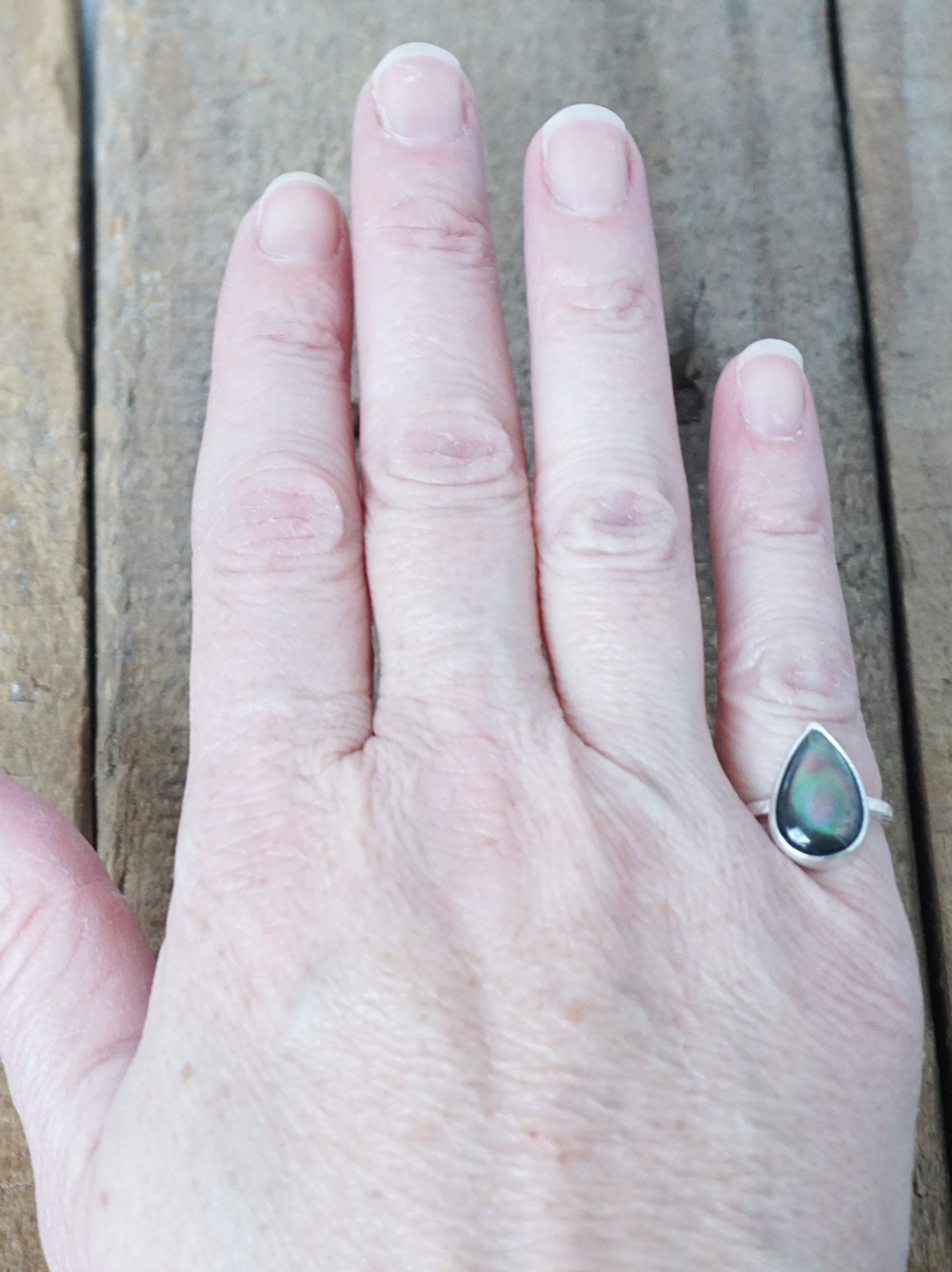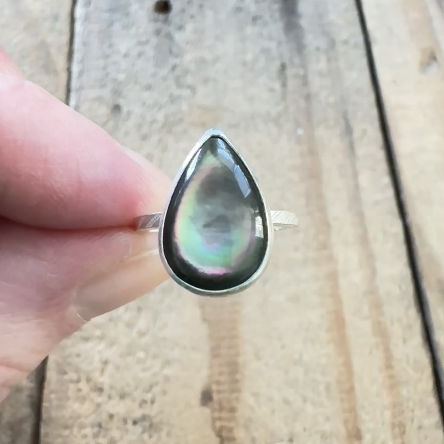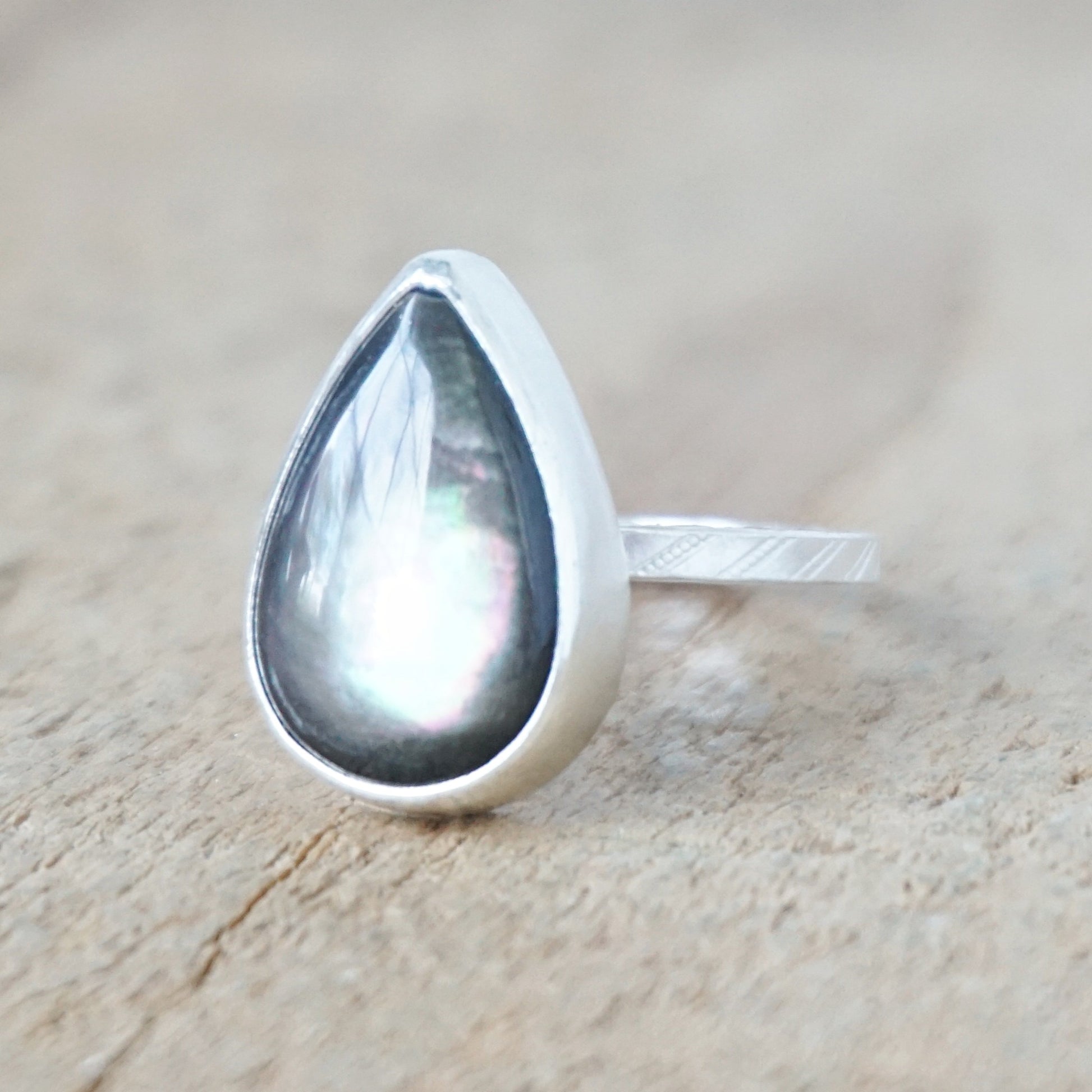 Size 5 grey mother of pearl stacking ring. I chose a simple setting to accent the natural beauty of the mother of pearl.