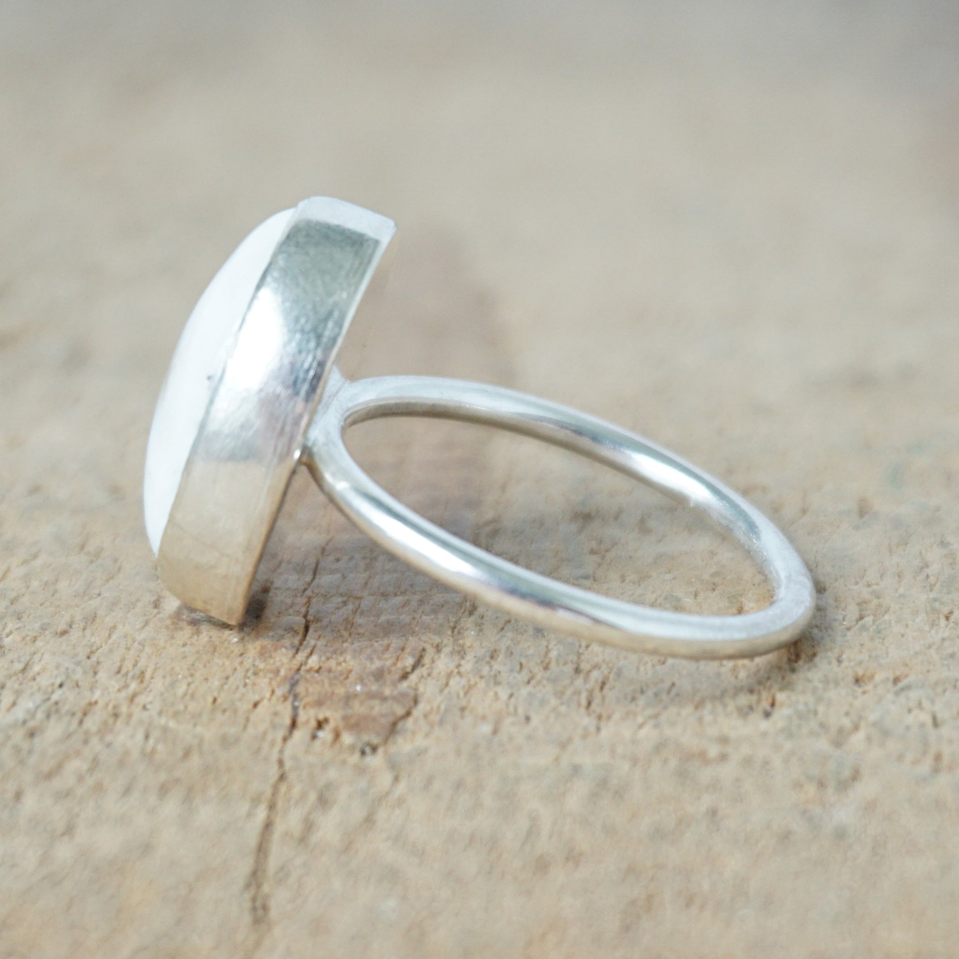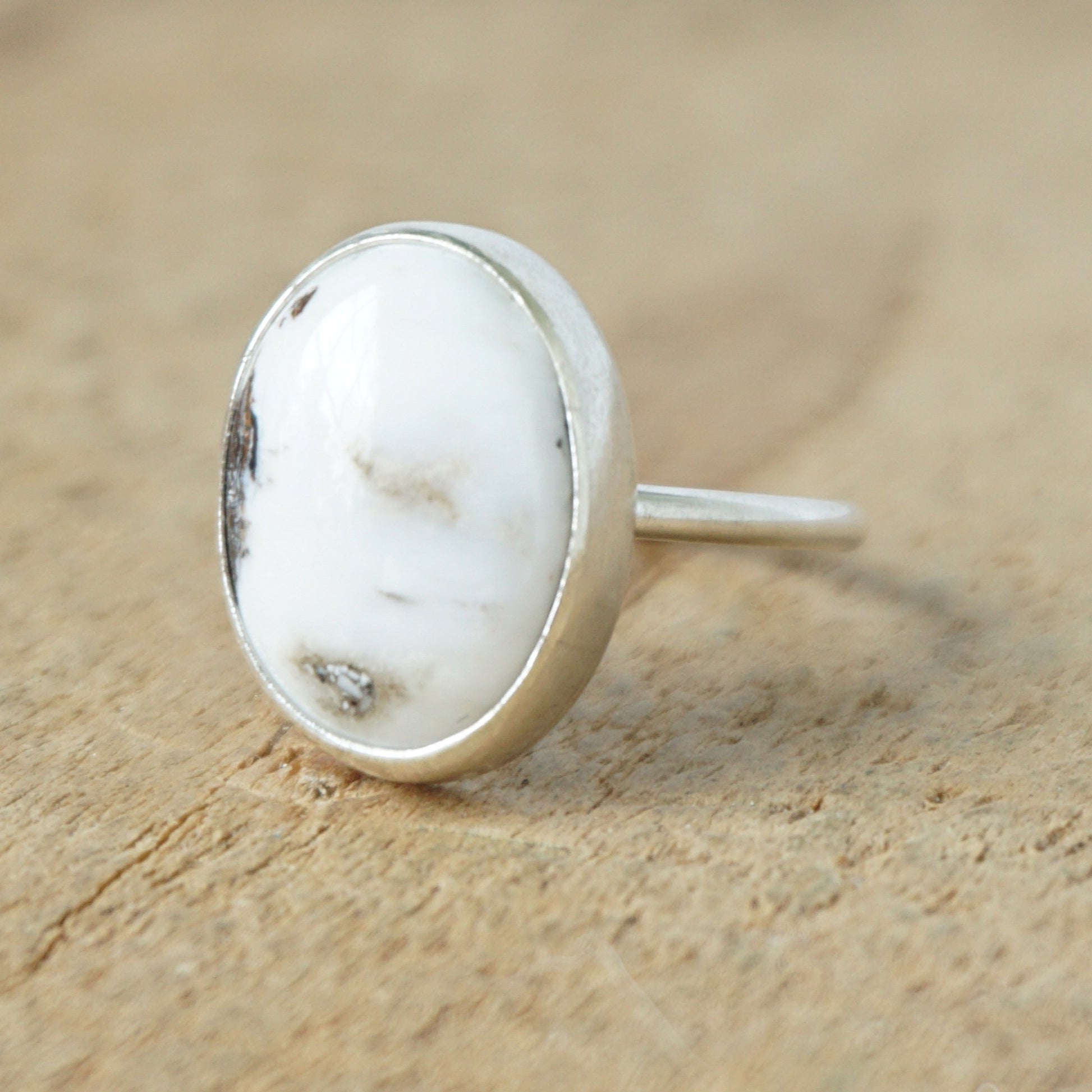 Size 6 1/2 white buffalo stacking ring. I chose a simple setting to accent the natural beauty of the white buffalo.