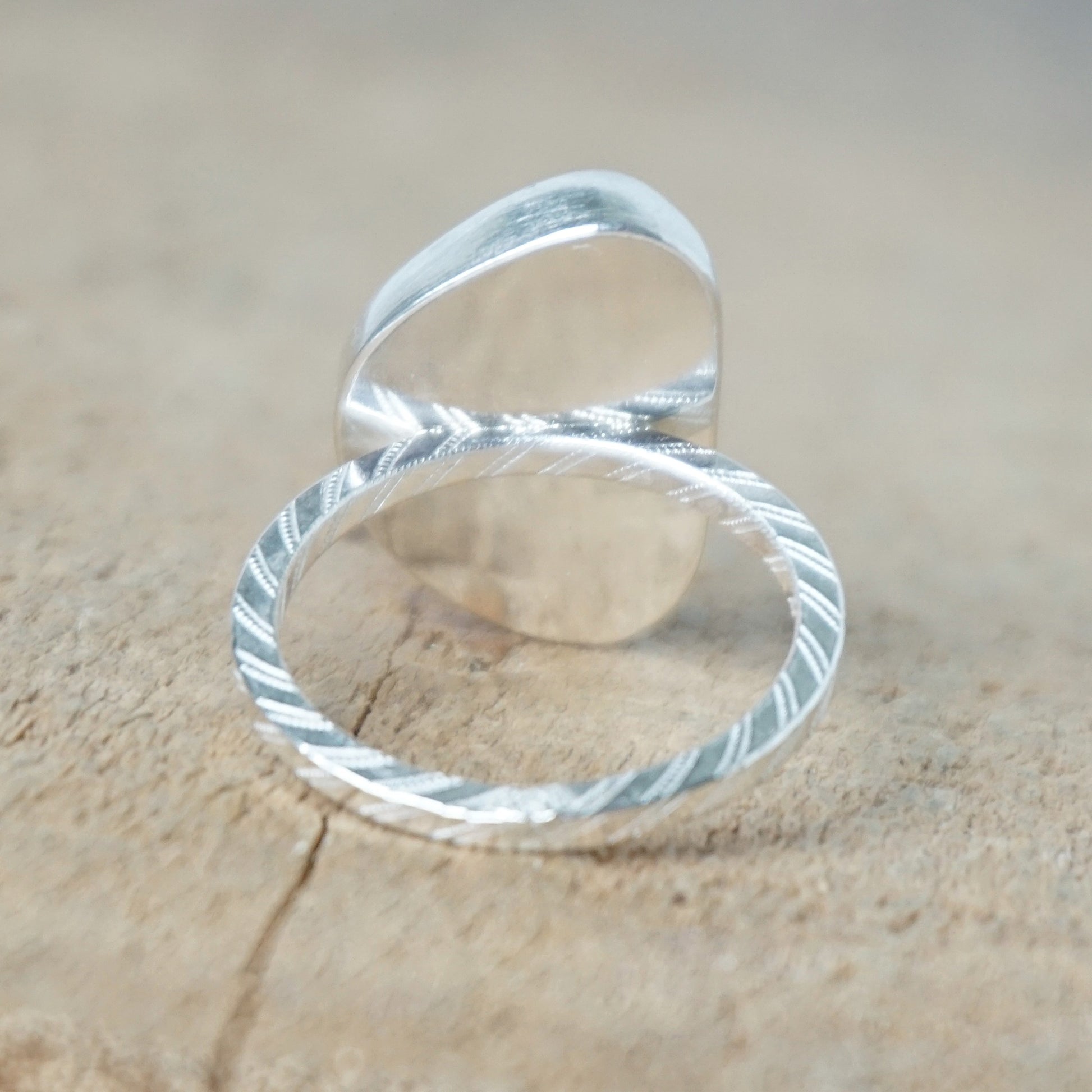 - The bezel is fine silver, while the backplate and ring shank are sterling silver