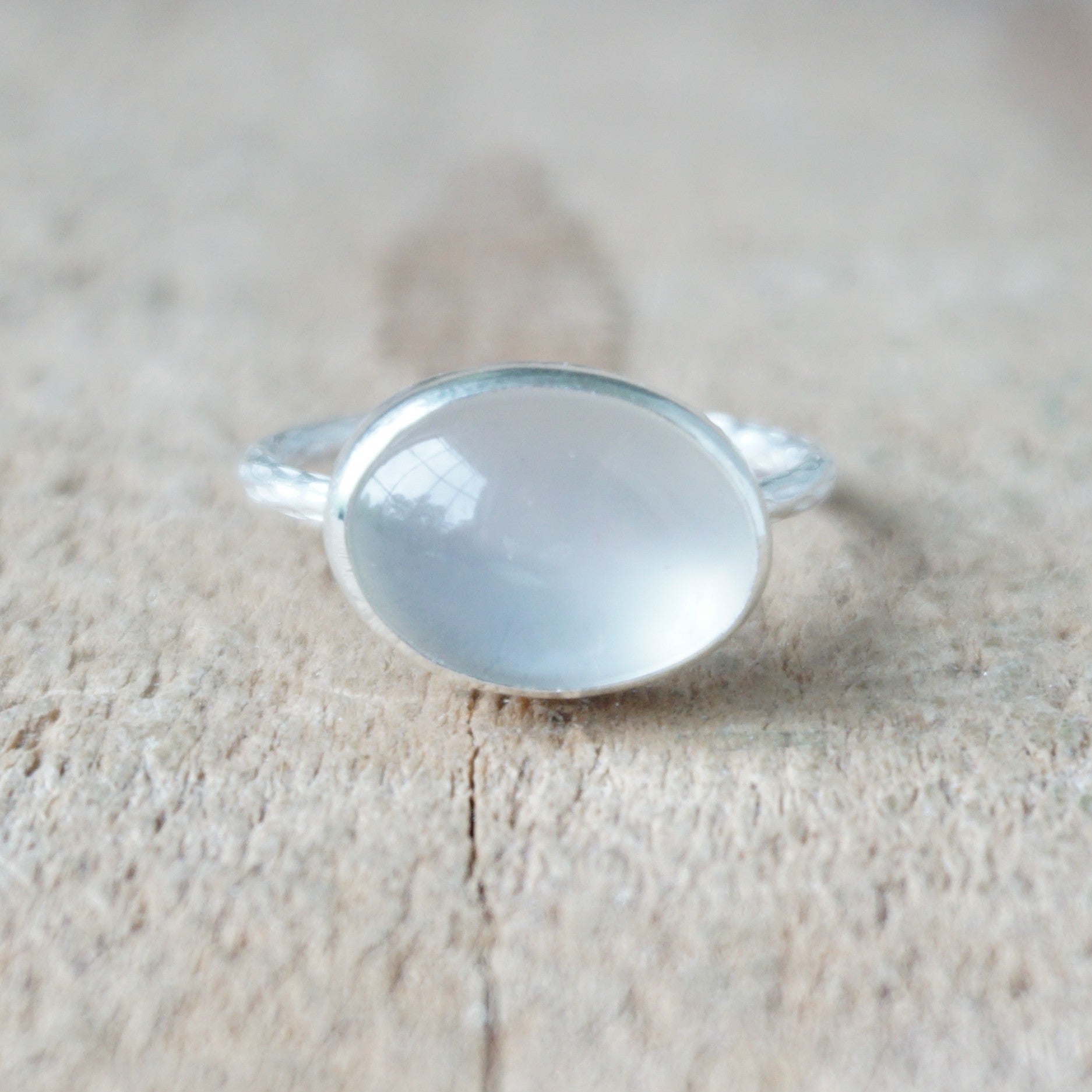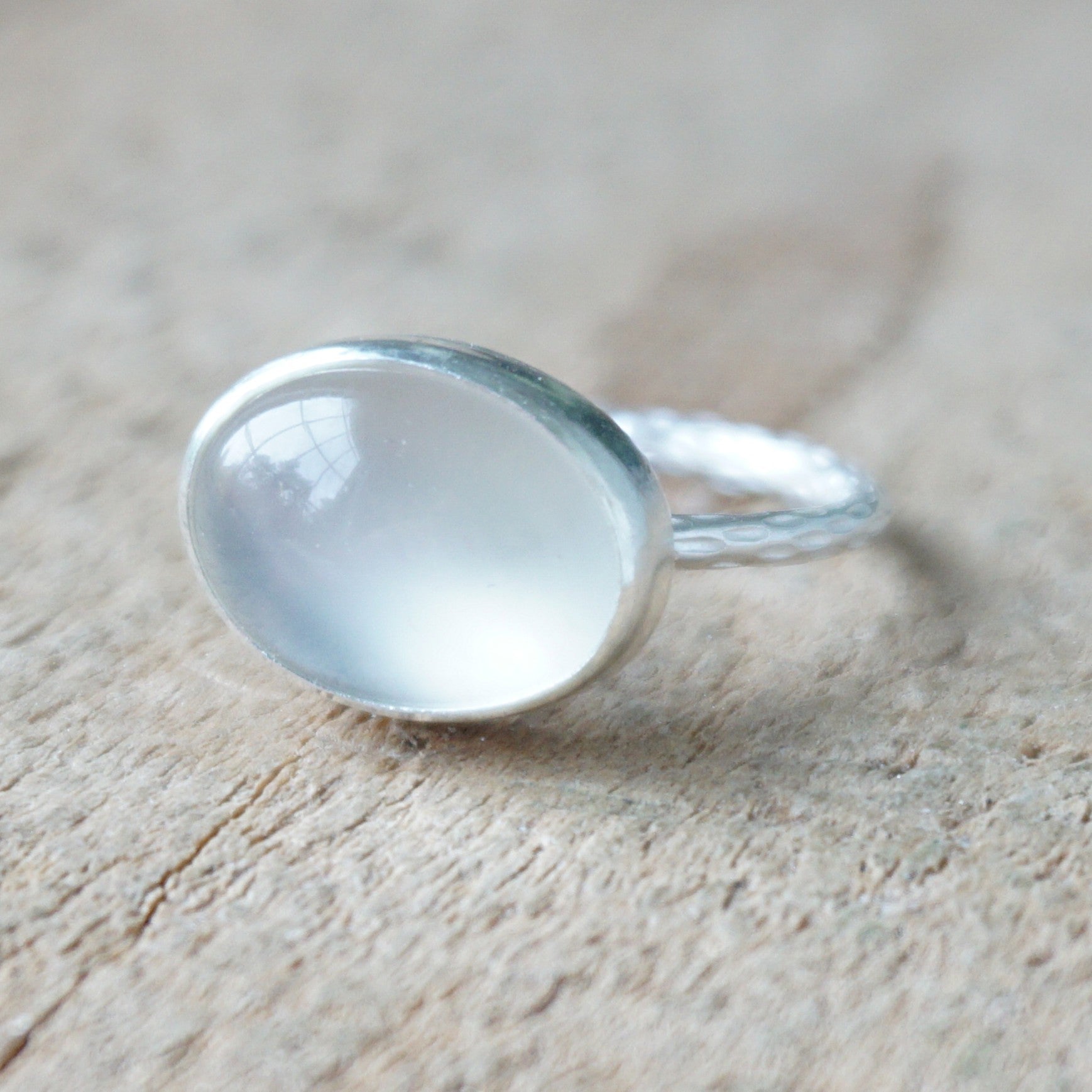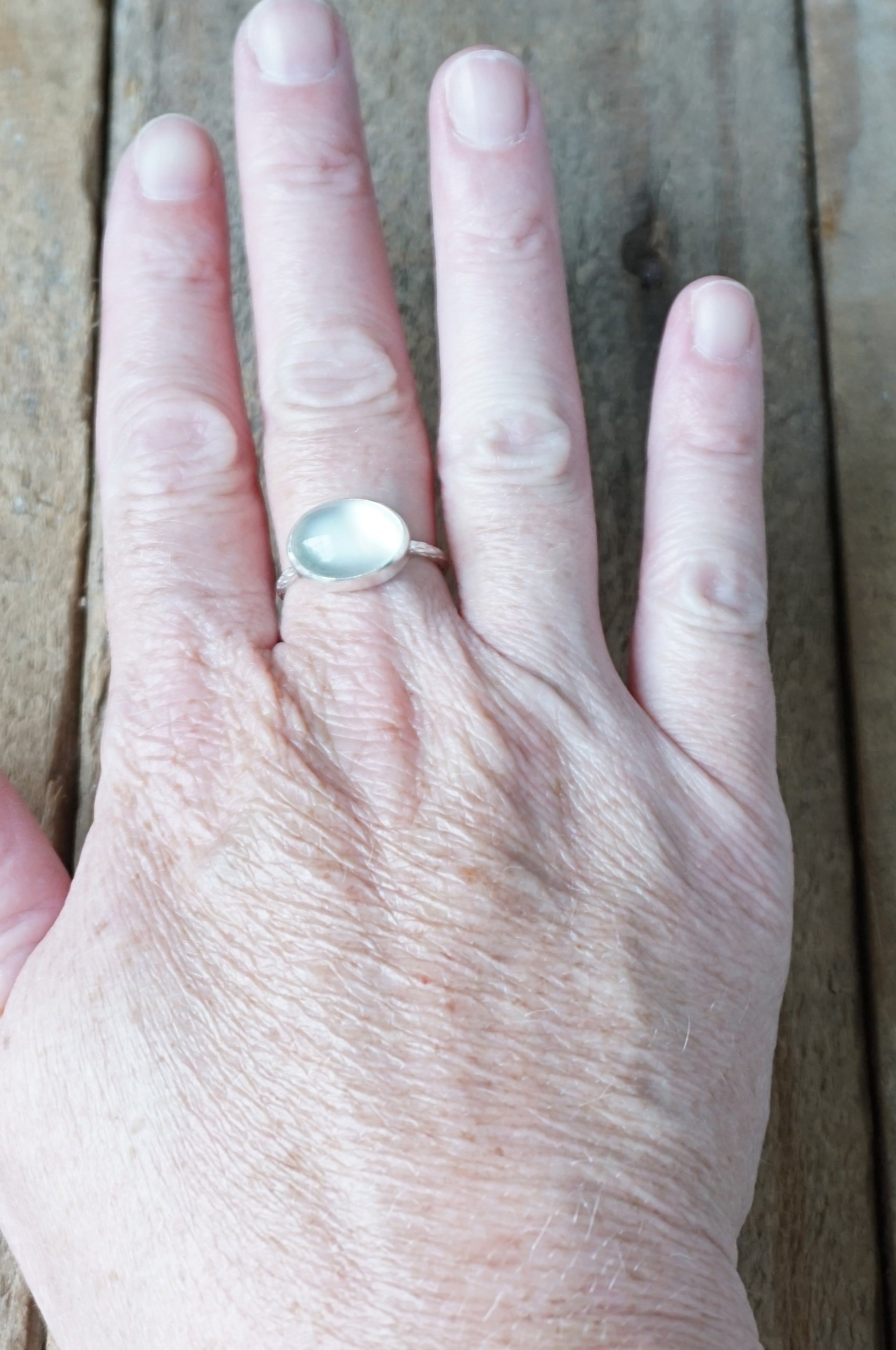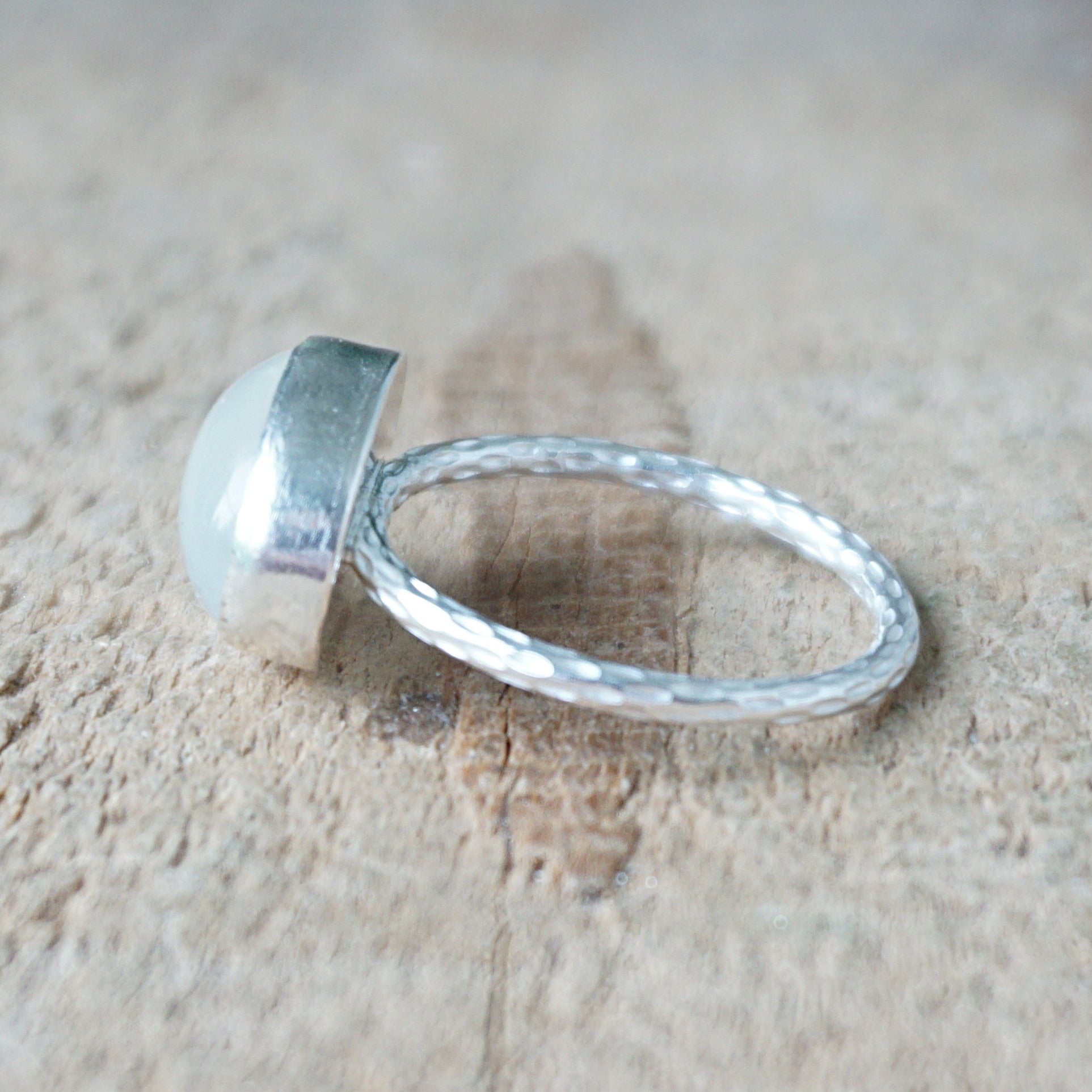 Size 7 1/2 moonstone stacking ring. I chose a simple setting to accent the natural beauty of the moonstone. This is not a rainbow moonstone, more of a milky color.