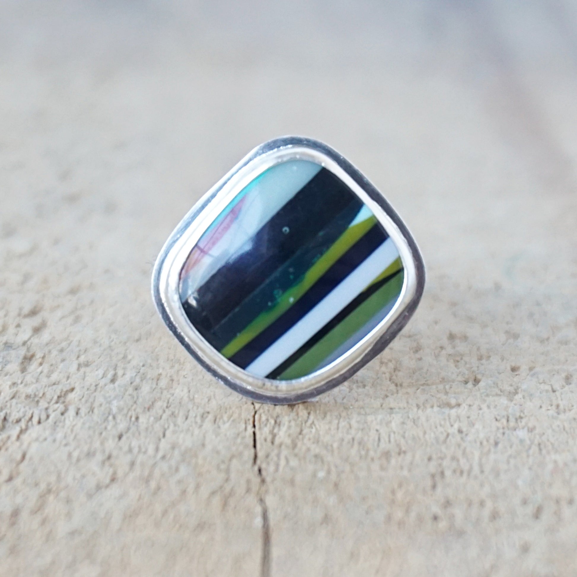 Surfite is made using resin from surfboard shapers - it builds up layers over time on the shop floor, and when upcycled into cabochons, looks amazing! Each layer represents a surfboard that was made at one point.