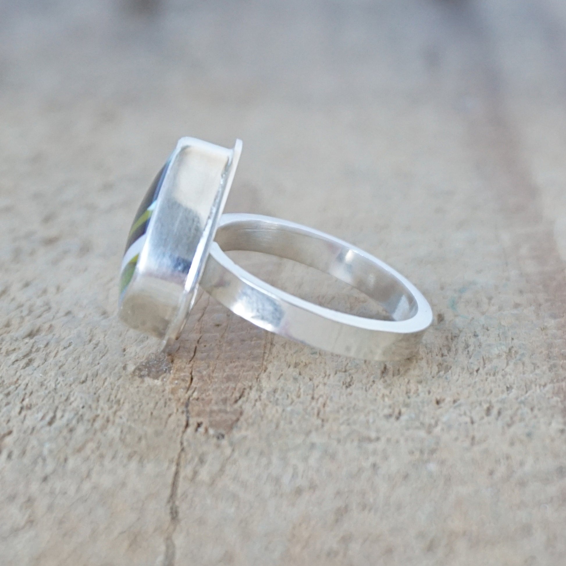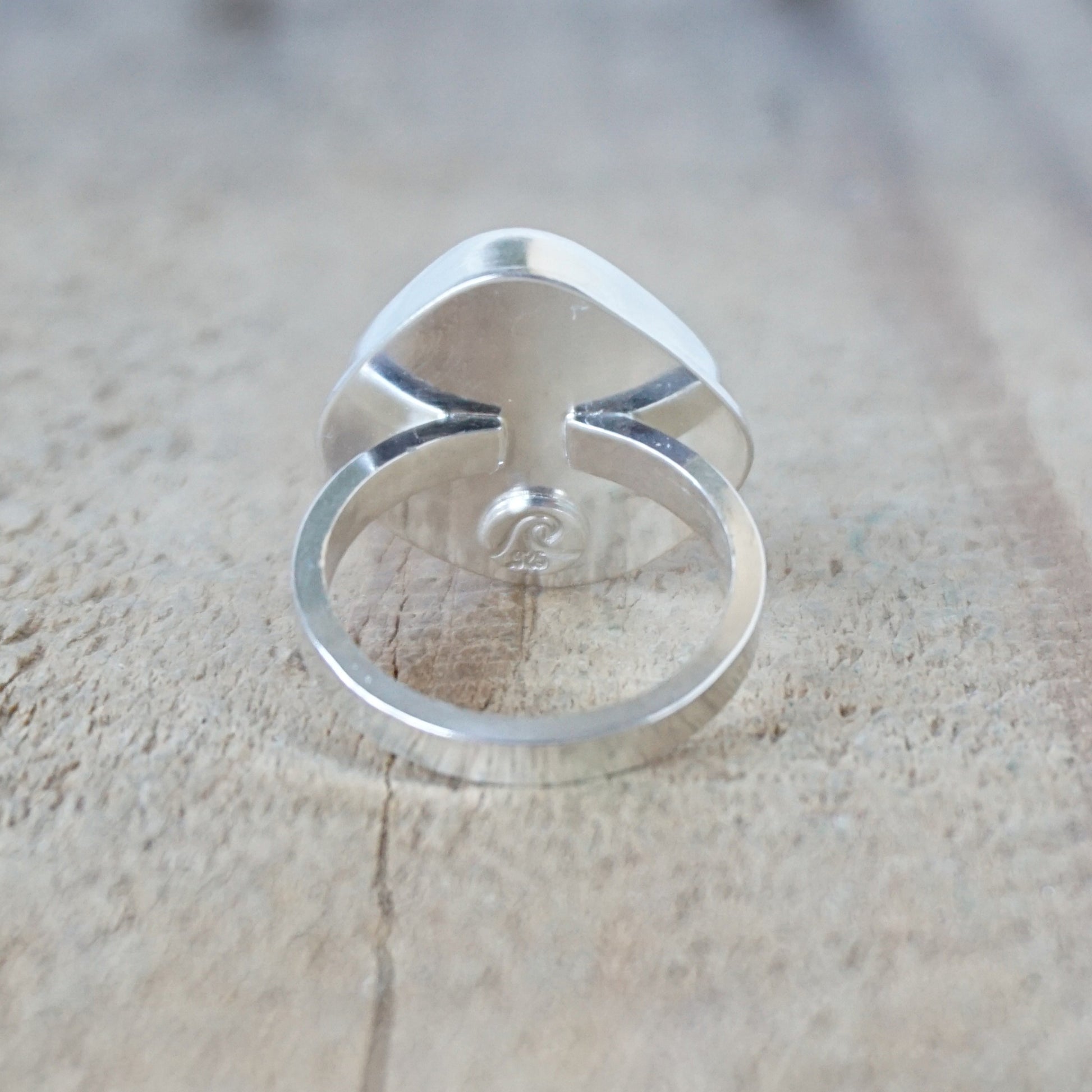 - The bezel is fine silver, while the backplate and ring shank are sterling silver