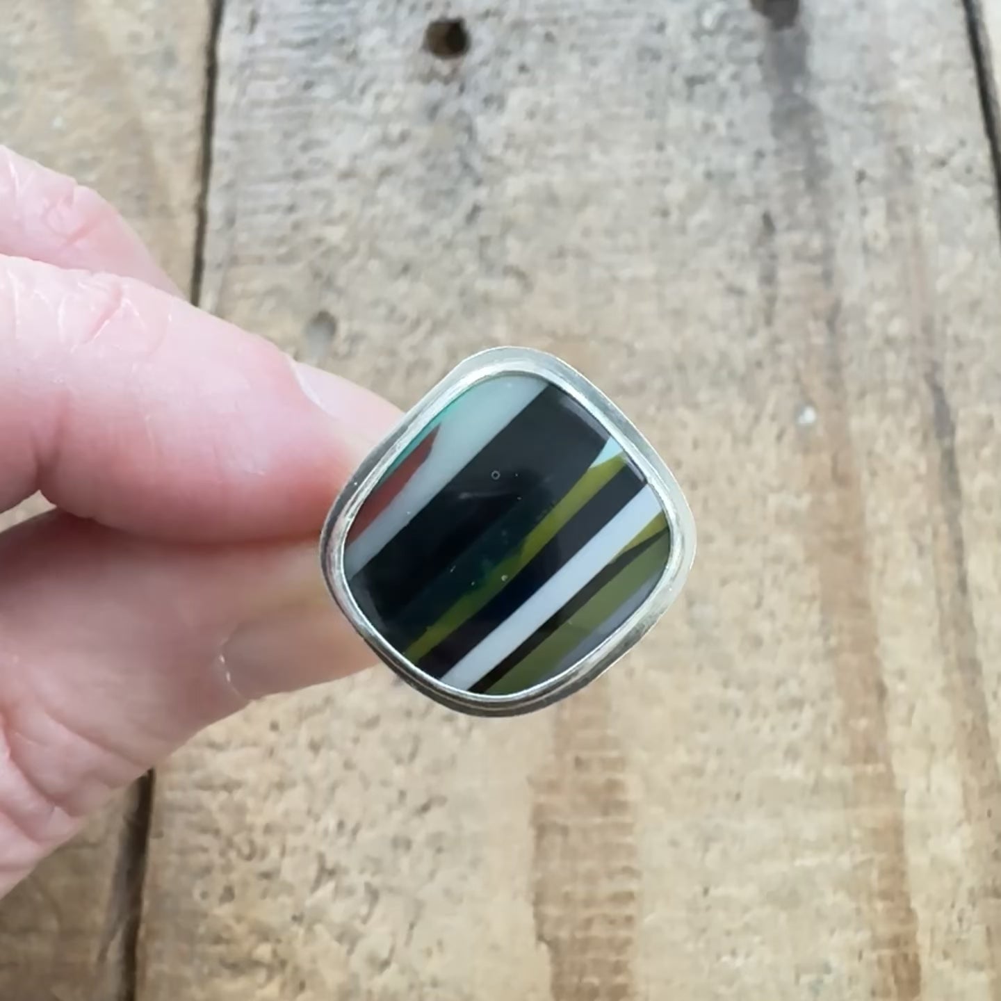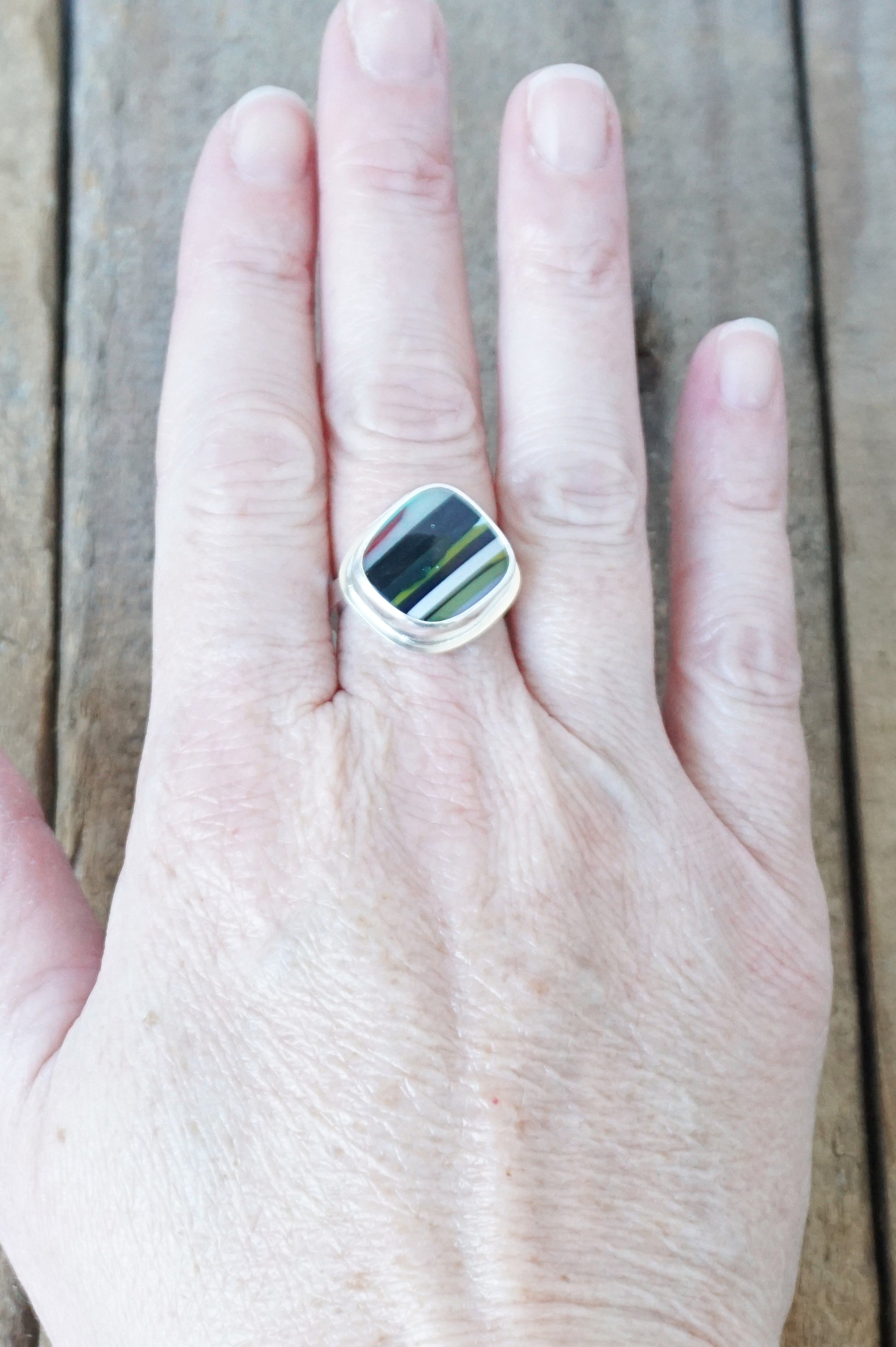 Size 7 1/2 surfite statement ring. I chose a simple setting to accent the natural beauty of the surfite.