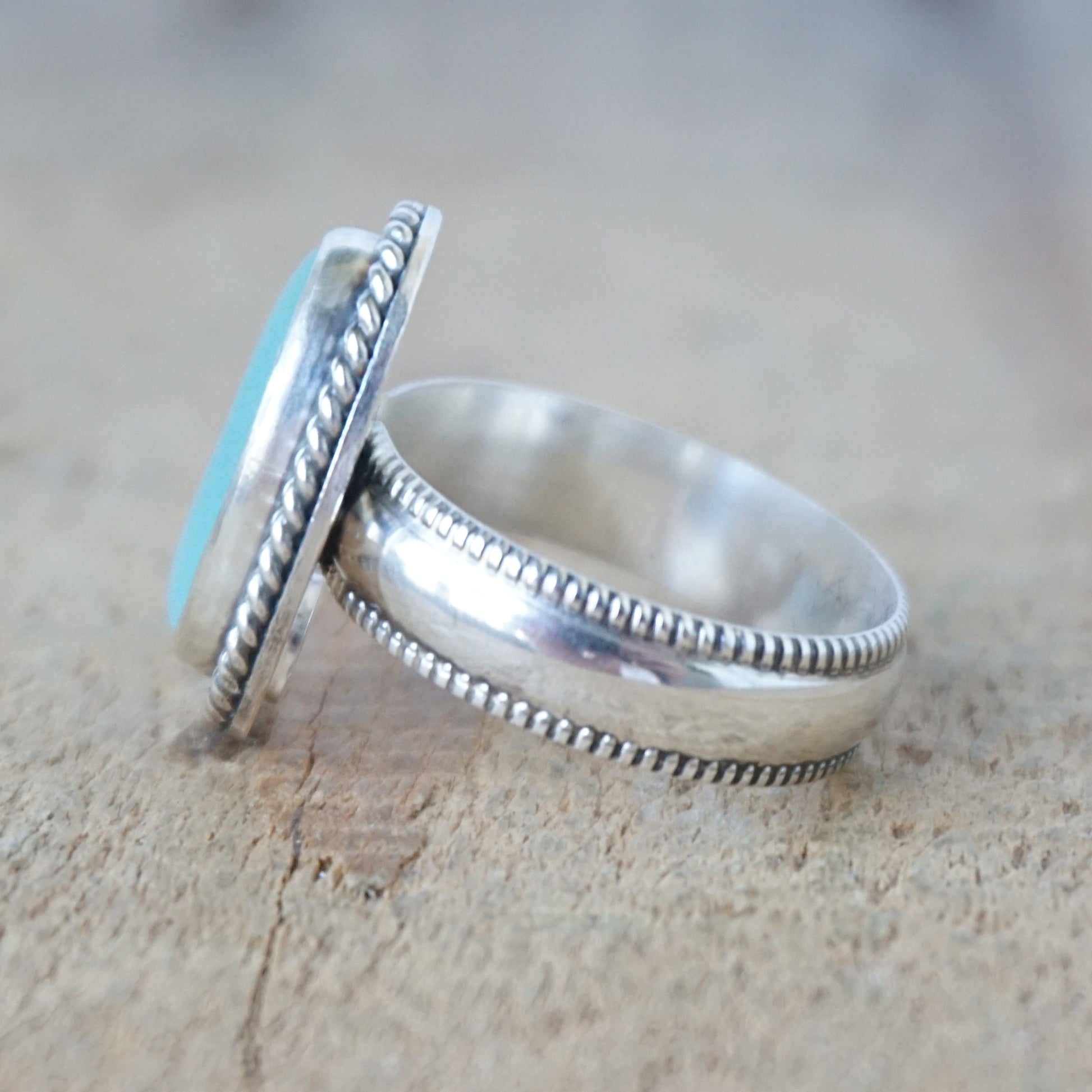 Size 8 1/2 teal blue green sea glass statement ring. I trimmed the sea glass with a twist accent, and oxidized it to bring out details. The band features millgrain detail.