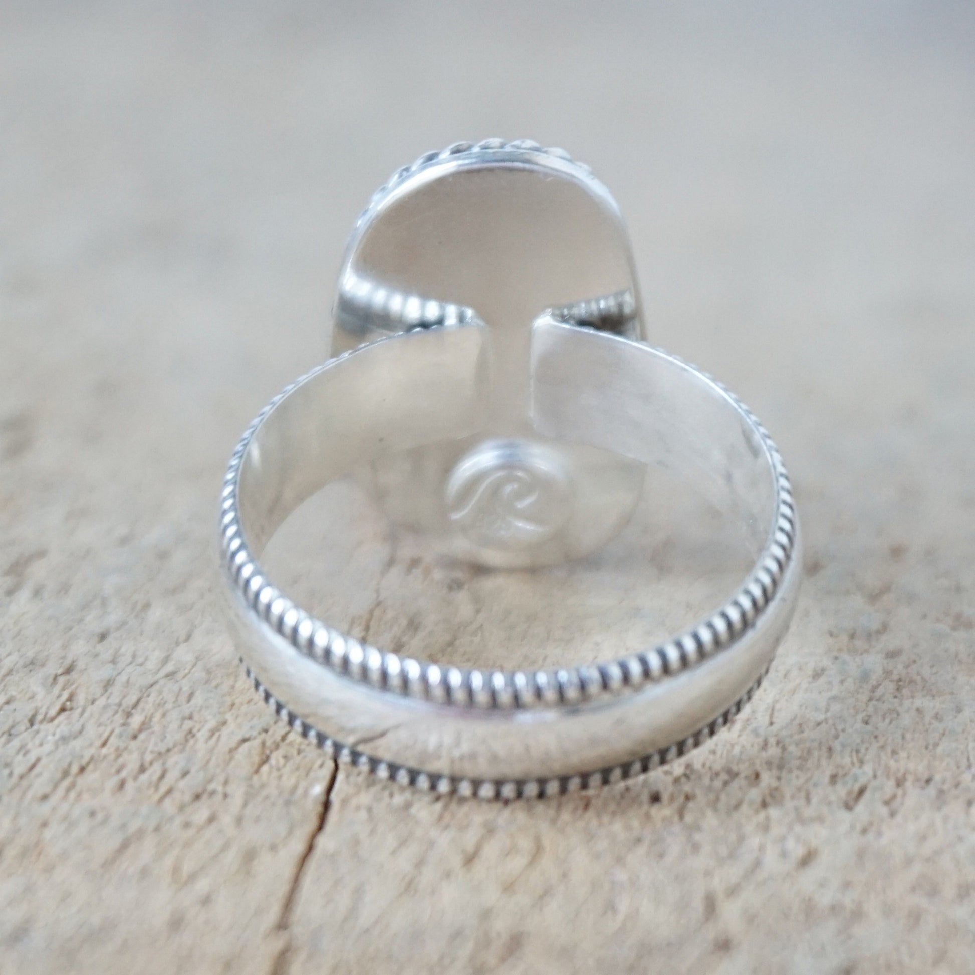 - The bezel is fine silver, while the backplate and ring shank are sterling silver