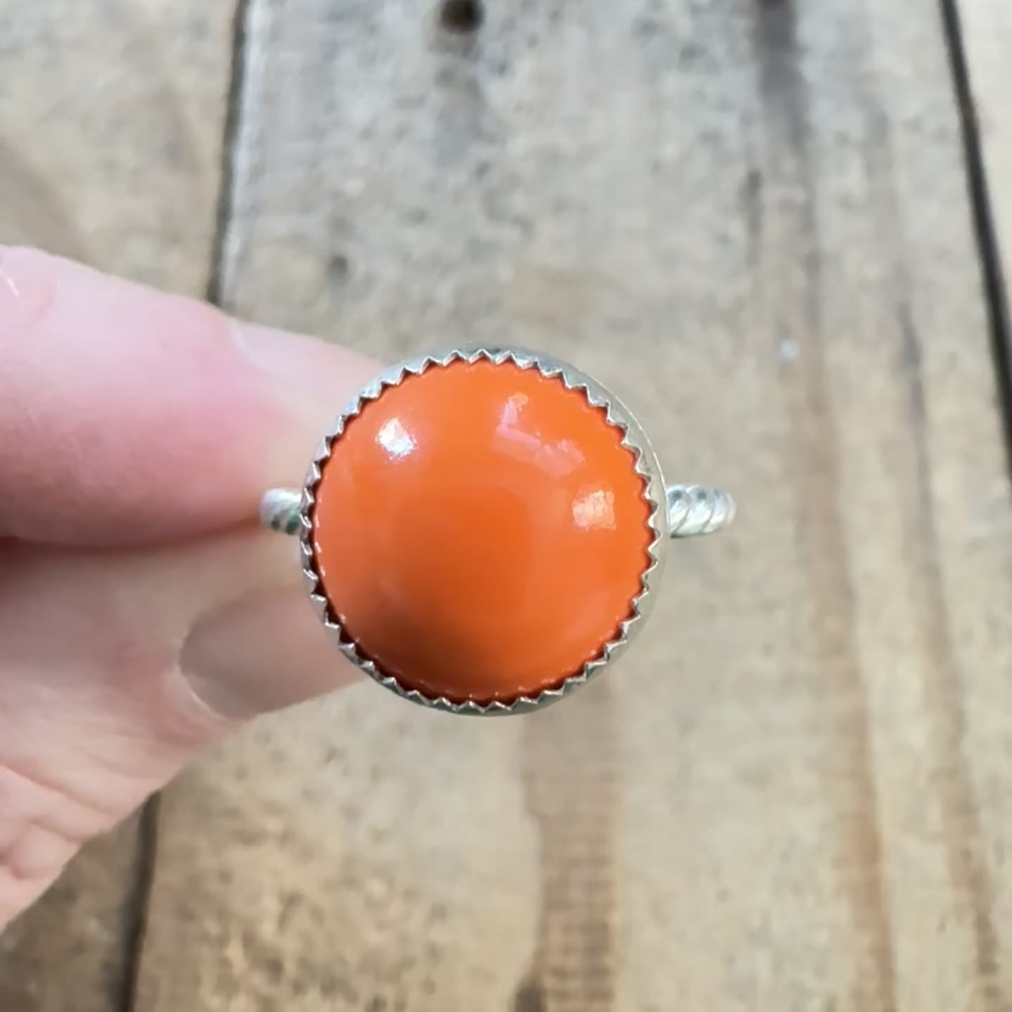 Size 8 1/4 orange rosarita stacking ring. I chose a simple setting to accent the natural beauty of the rosarita.