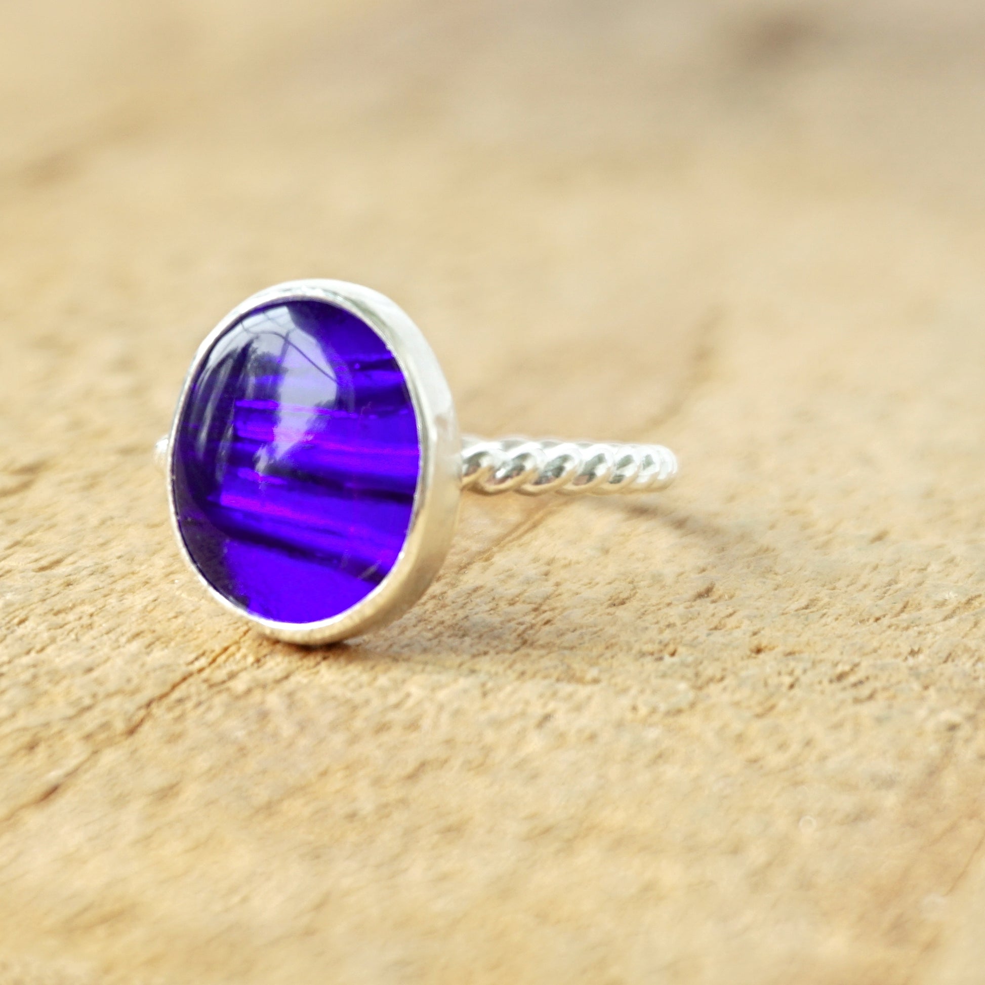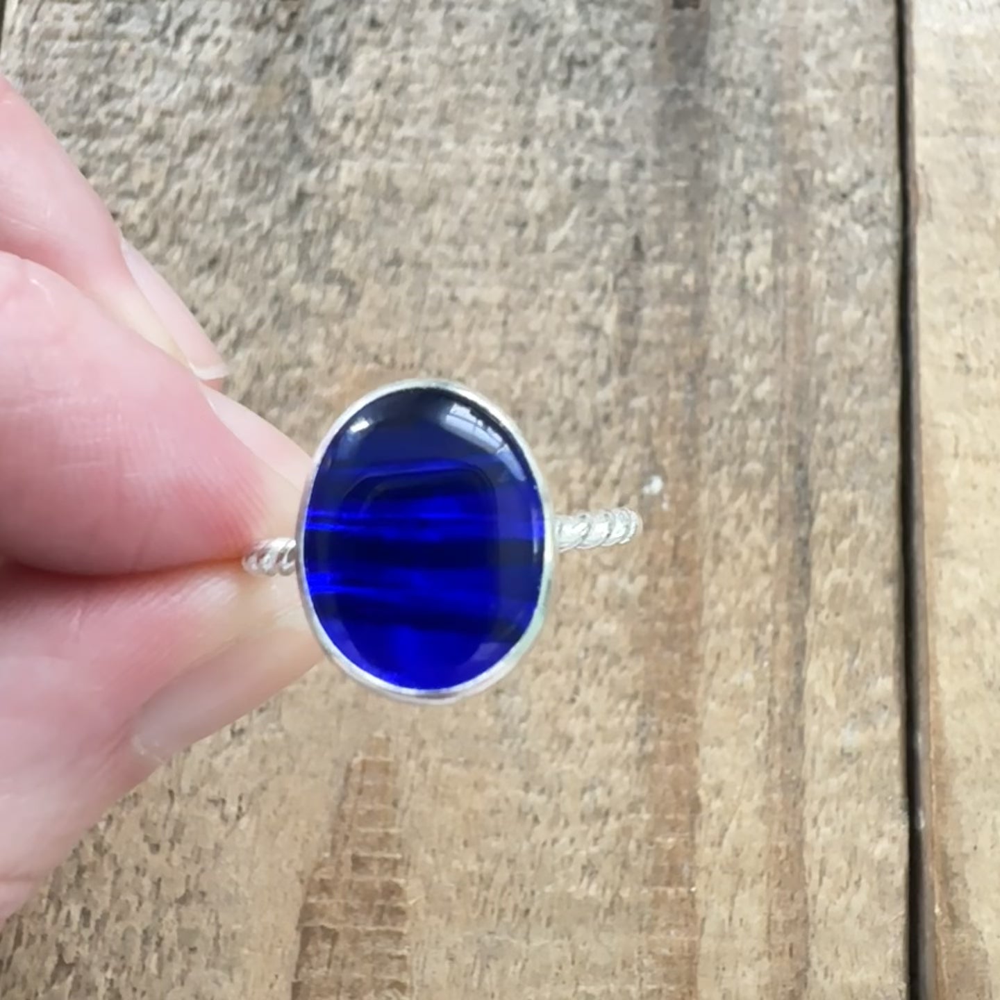Size 8 3/4 cobalt blue antique glass stacking ring. A pattern has been carved in the back of the glass, and shows through the top. I chose a simple setting to accent the natural beauty of the glass.