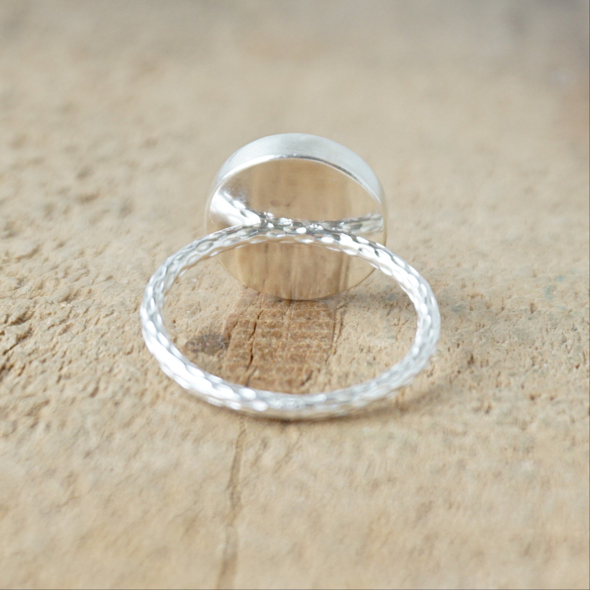 - The bezel is fine silver, while the backplate and ring shank are sterling silver