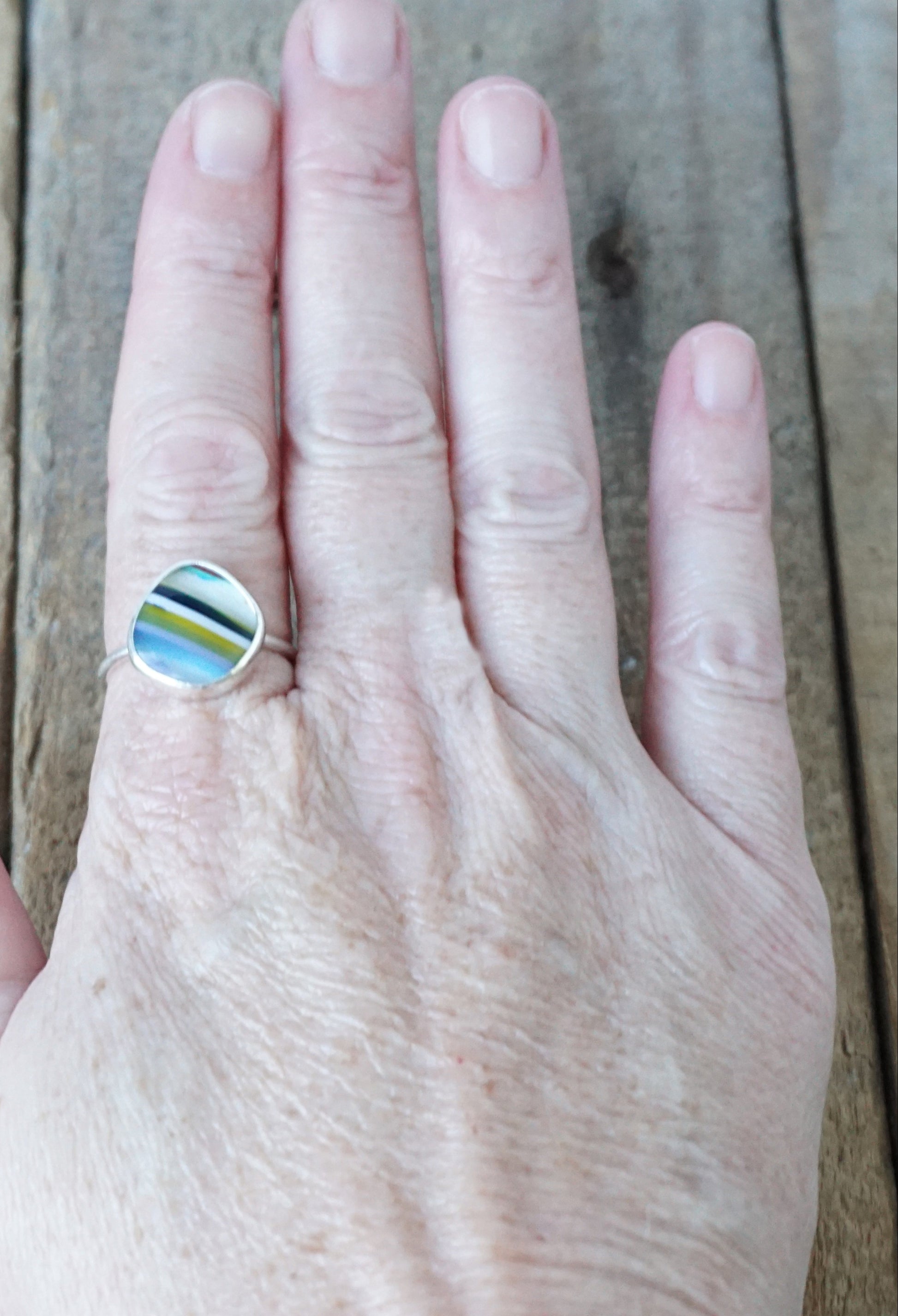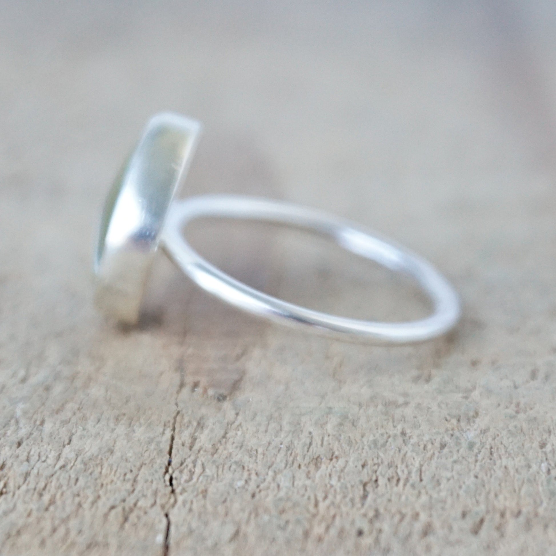 Size 9 1/2 surfite stacking ring. I chose a simple setting to accent the natural beauty of the surfite.