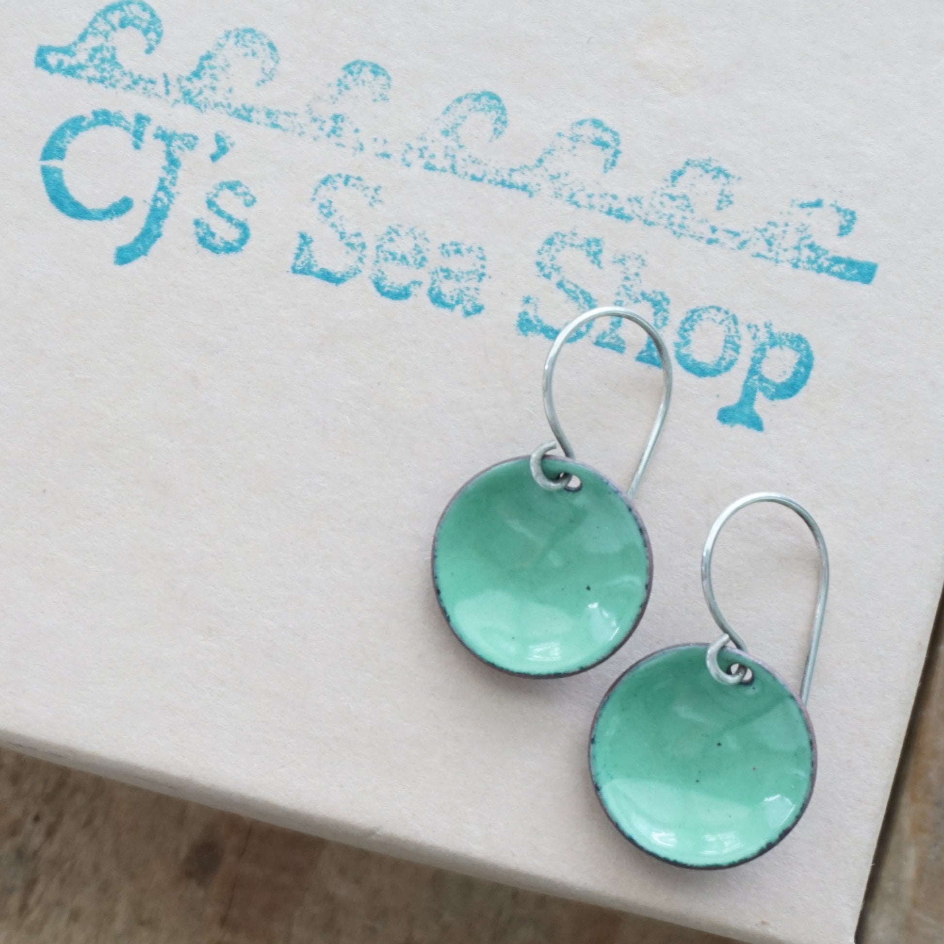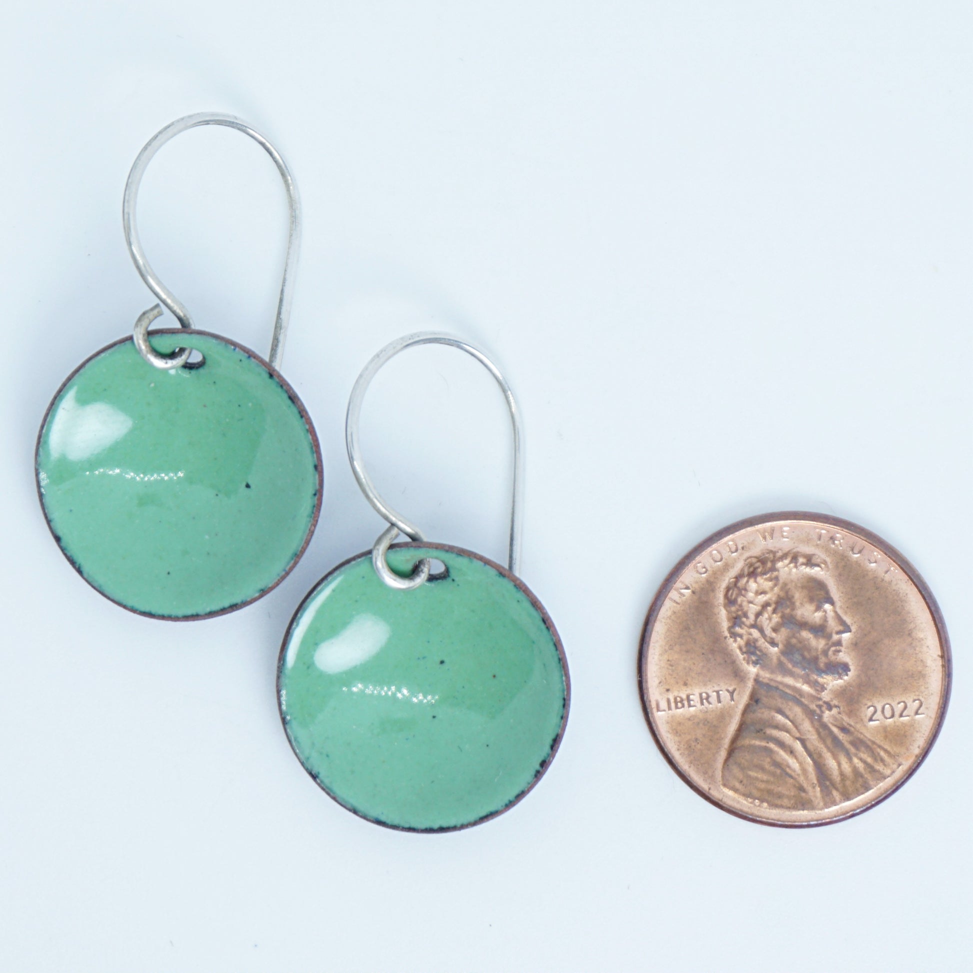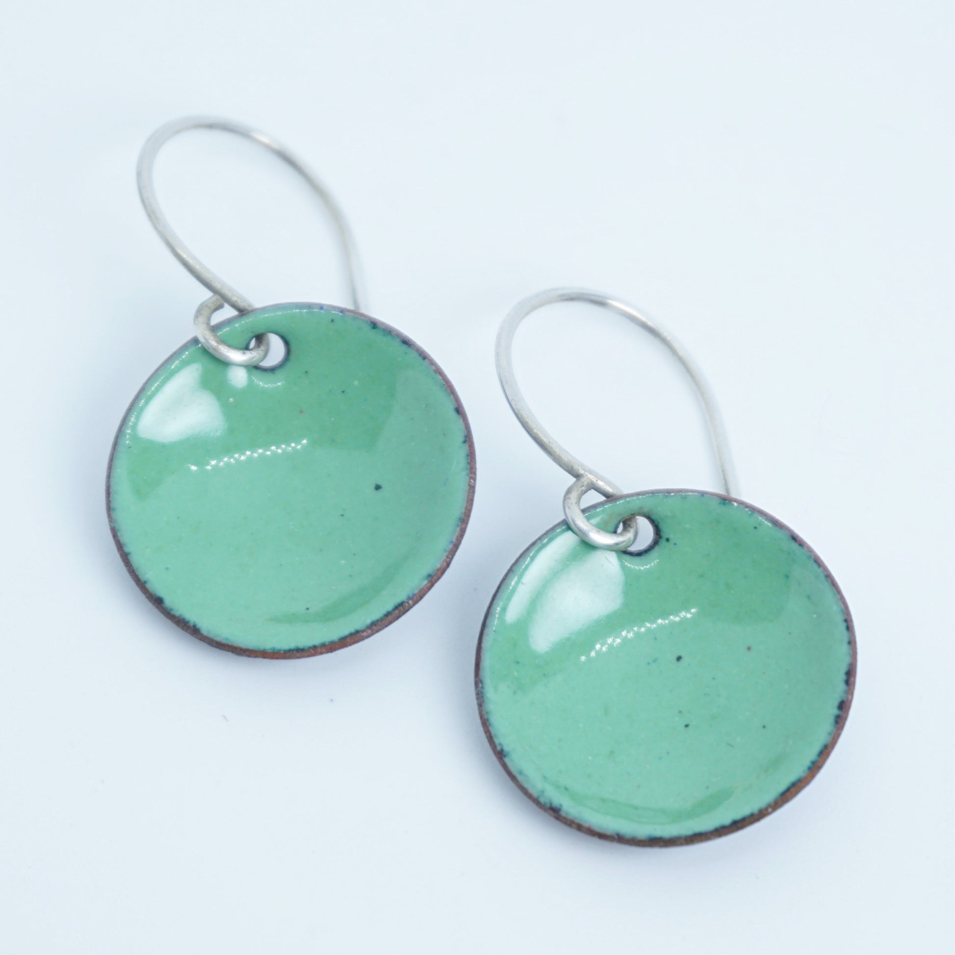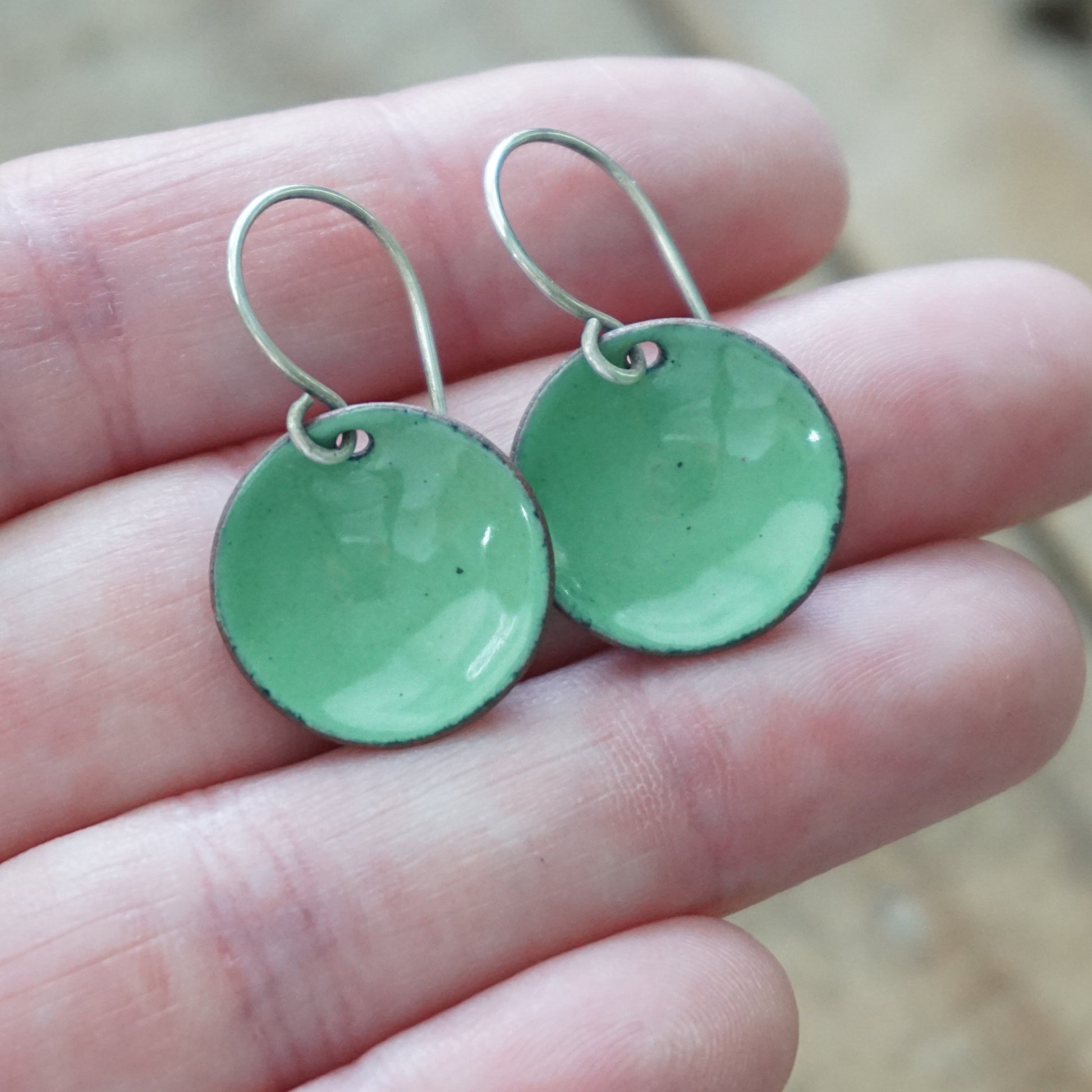 To create these earrings, I hand punch and dome the copper blanks. I then fire lead free vitreous enamel in a kiln to over 1500°. Multiple layers and firings are necessary to achieve the look of these earrings.