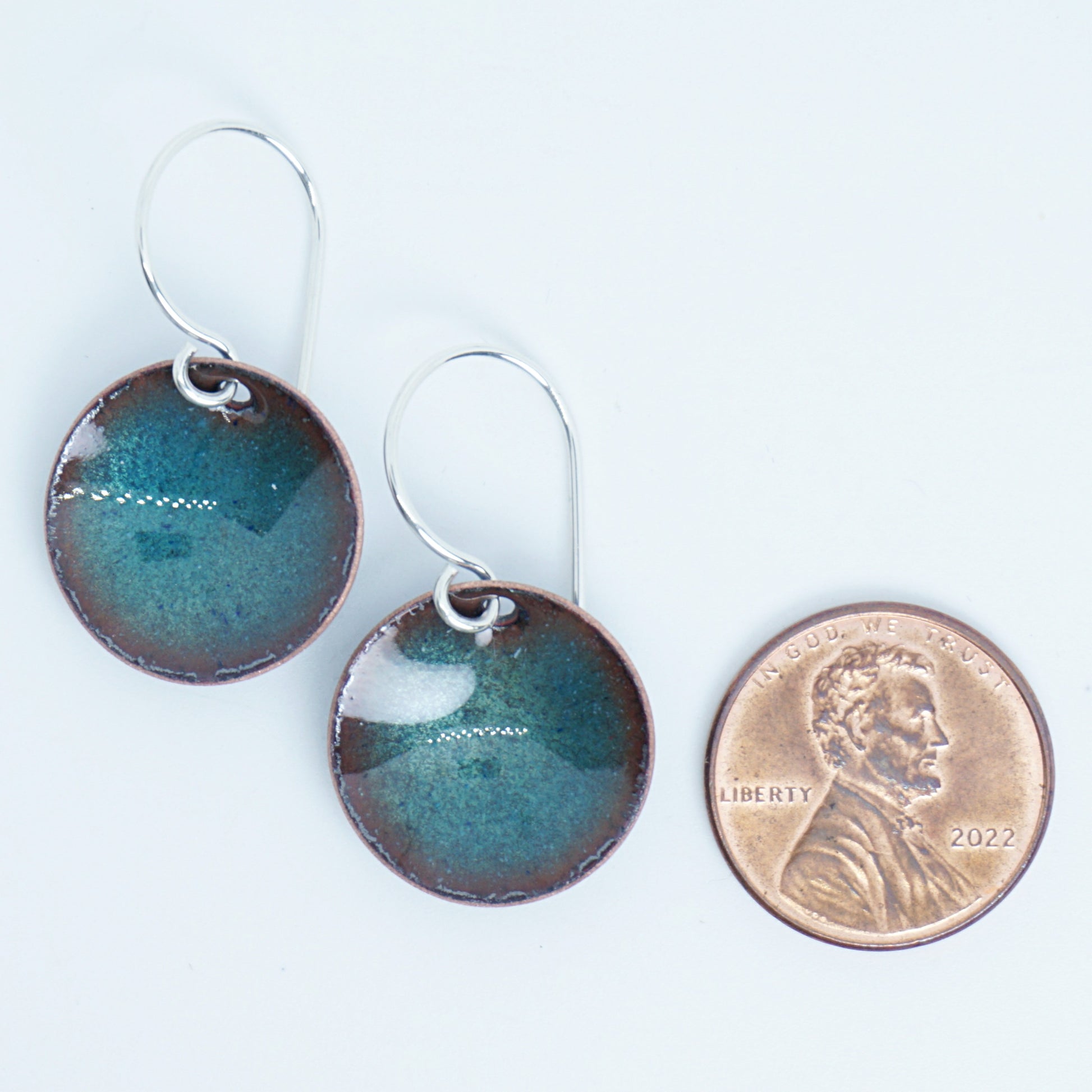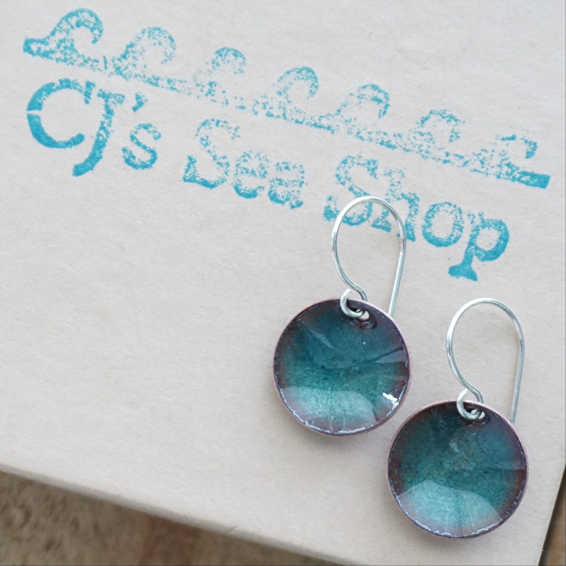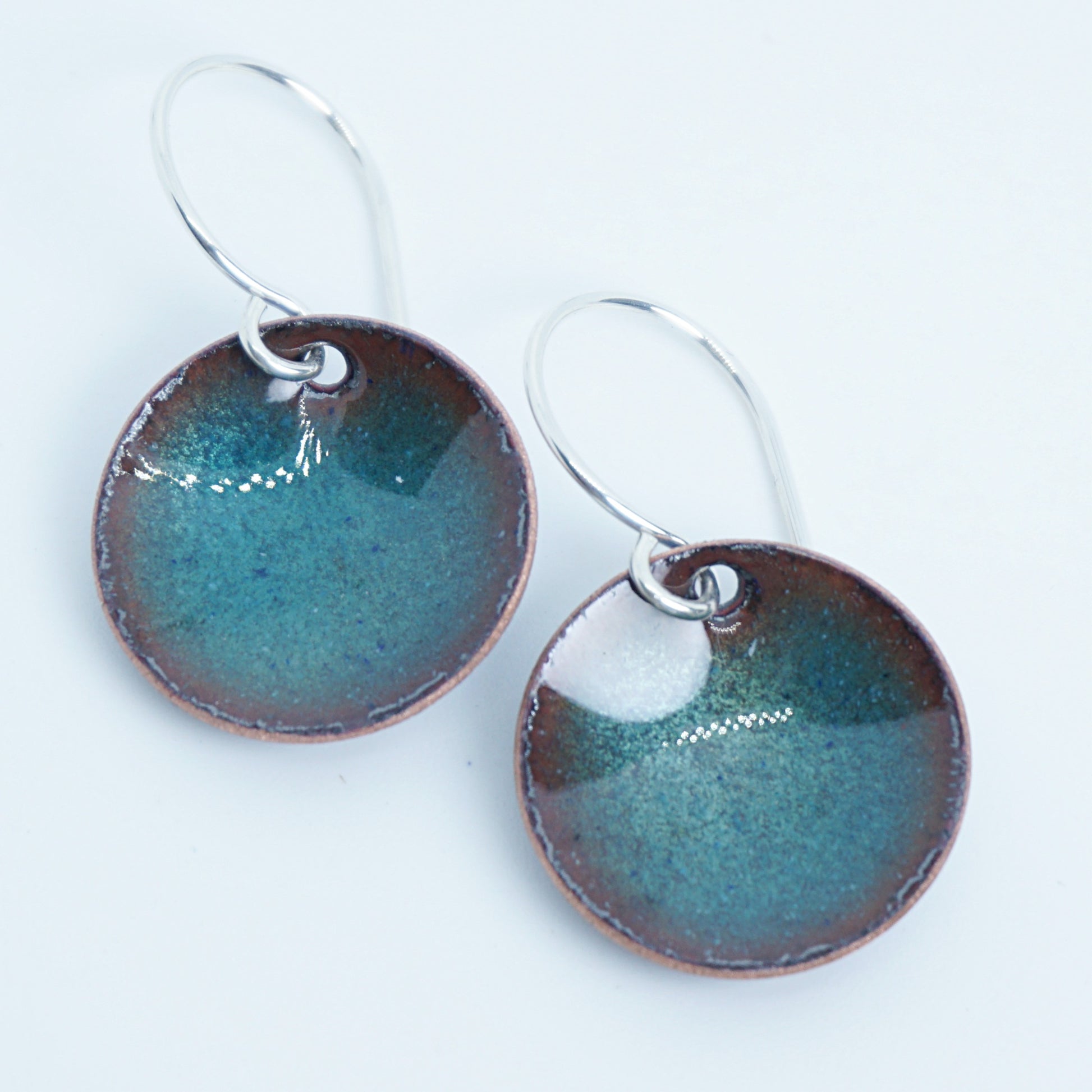 To create these earrings, I hand punch and dome the copper blanks. I then fire lead free vitreous enamel in a kiln to over 1500°. Multiple layers and firings are necessary to achieve the look of these earrings.