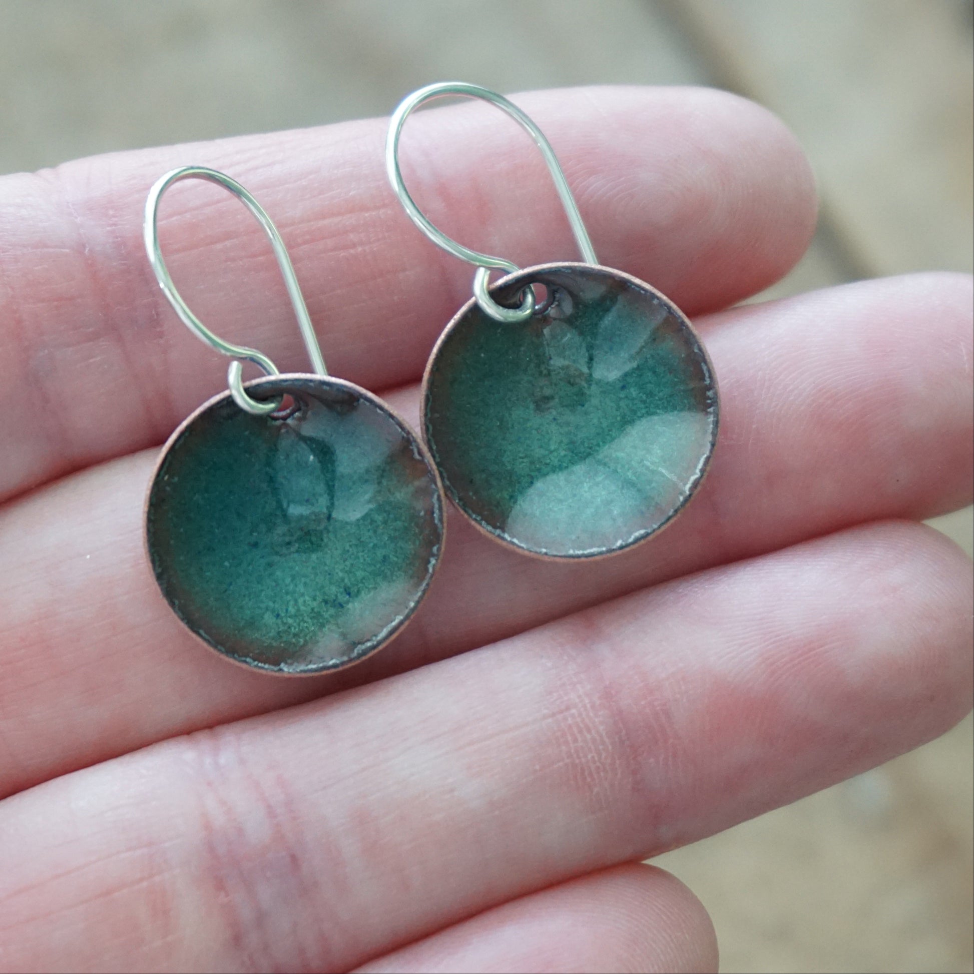 Teal green enamel earrings. It is hard to capture in the pictures, but since the enamel is transparent, they have a slight metallic look to them.