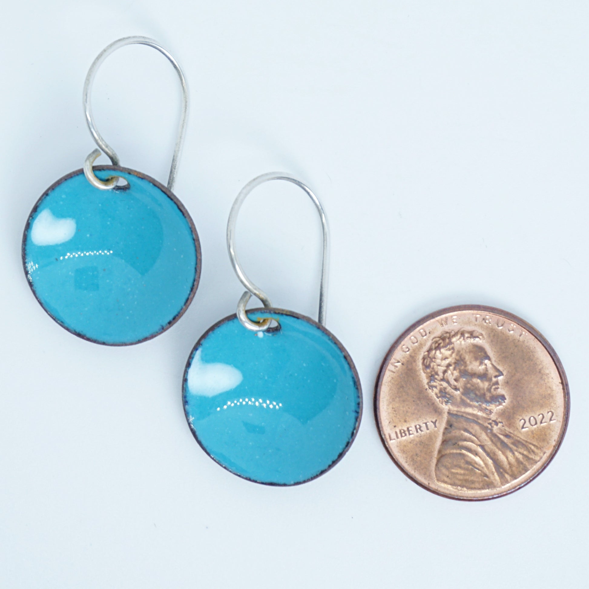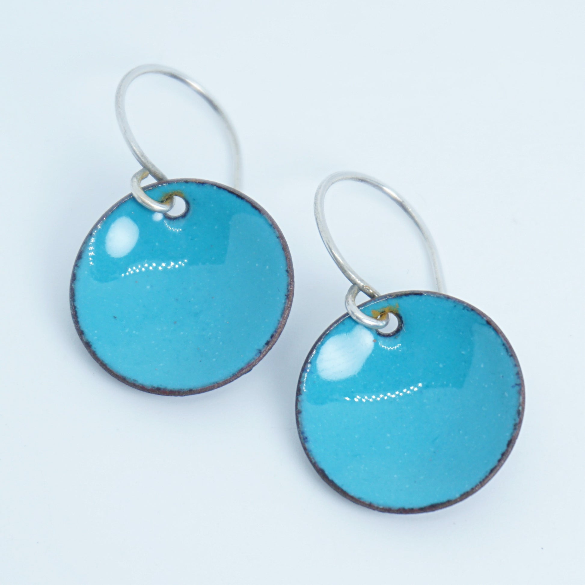 To create these earrings, I hand punch and dome the copper blanks. I then fire lead free vitreous enamel in a kiln to over 1500°. Multiple layers and firings are necessary to achieve the look of these earrings.