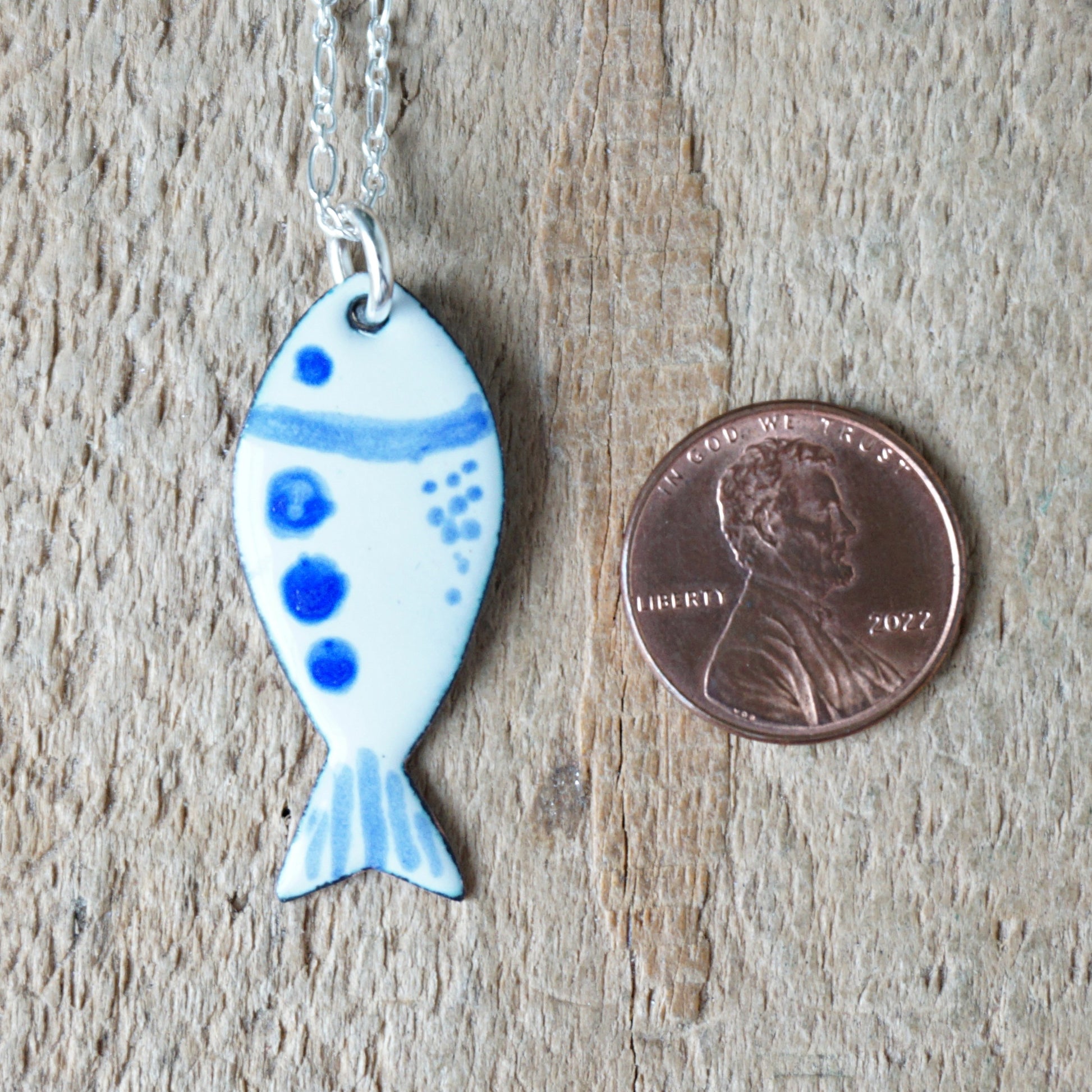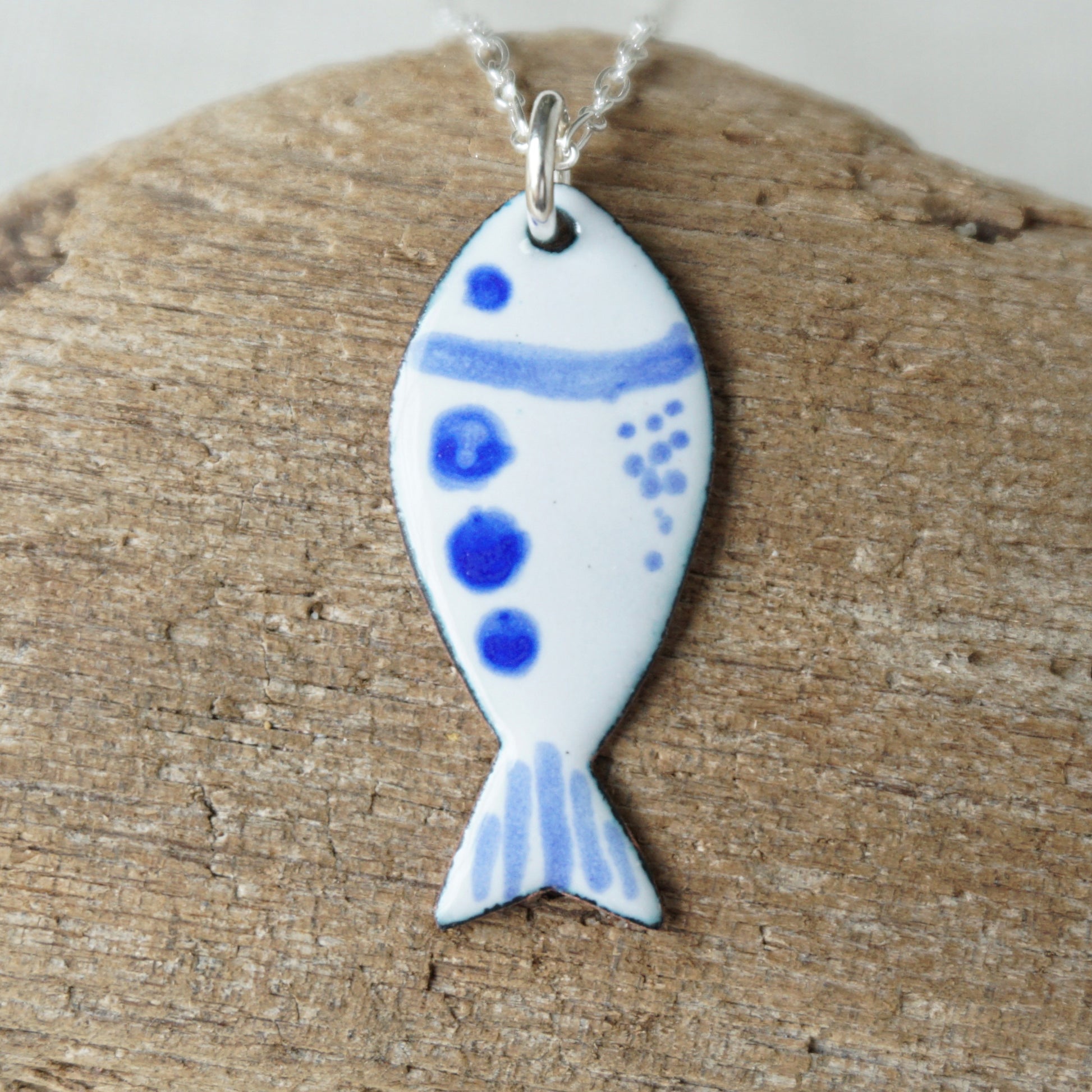 White and blue enamel fish pendant. The design is hand painted with enamel paint, and fired to make it permanent.