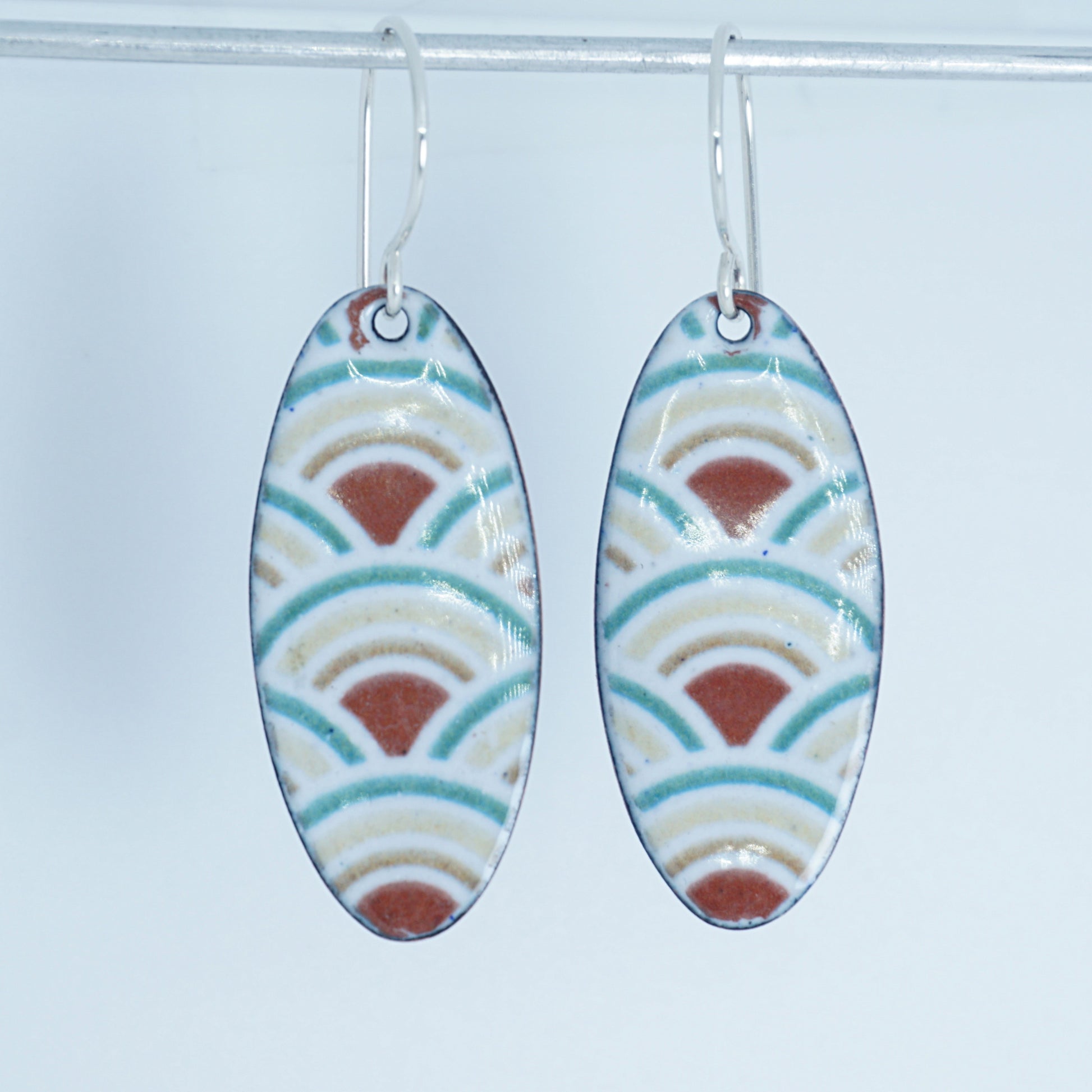 To create these earrings, I hand cut and dome the copper blanks. I then fire lead free vitreous enamel in a kiln to over 1500°. The flower design is achieved using kiln fired enamel decals. Multiple layers, techniques, and firings are necessary to achieve the look of these earrings.