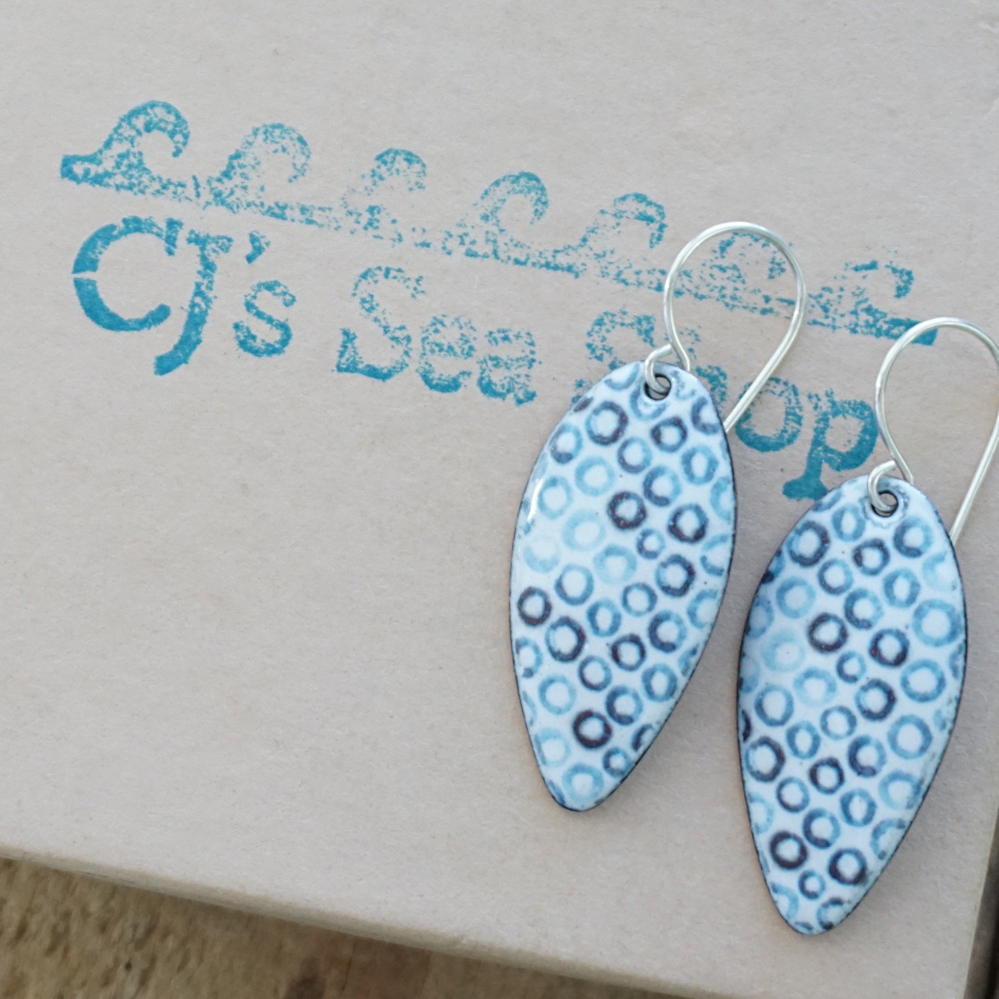 To create these earrings, I hand cut and dome the copper blanks. I then fire lead free vitreous enamel in a kiln to over 1500°. The flower design is achieved using kiln fired enamel decals. Multiple layers, techniques, and firings are necessary to achieve the look of these earrings.