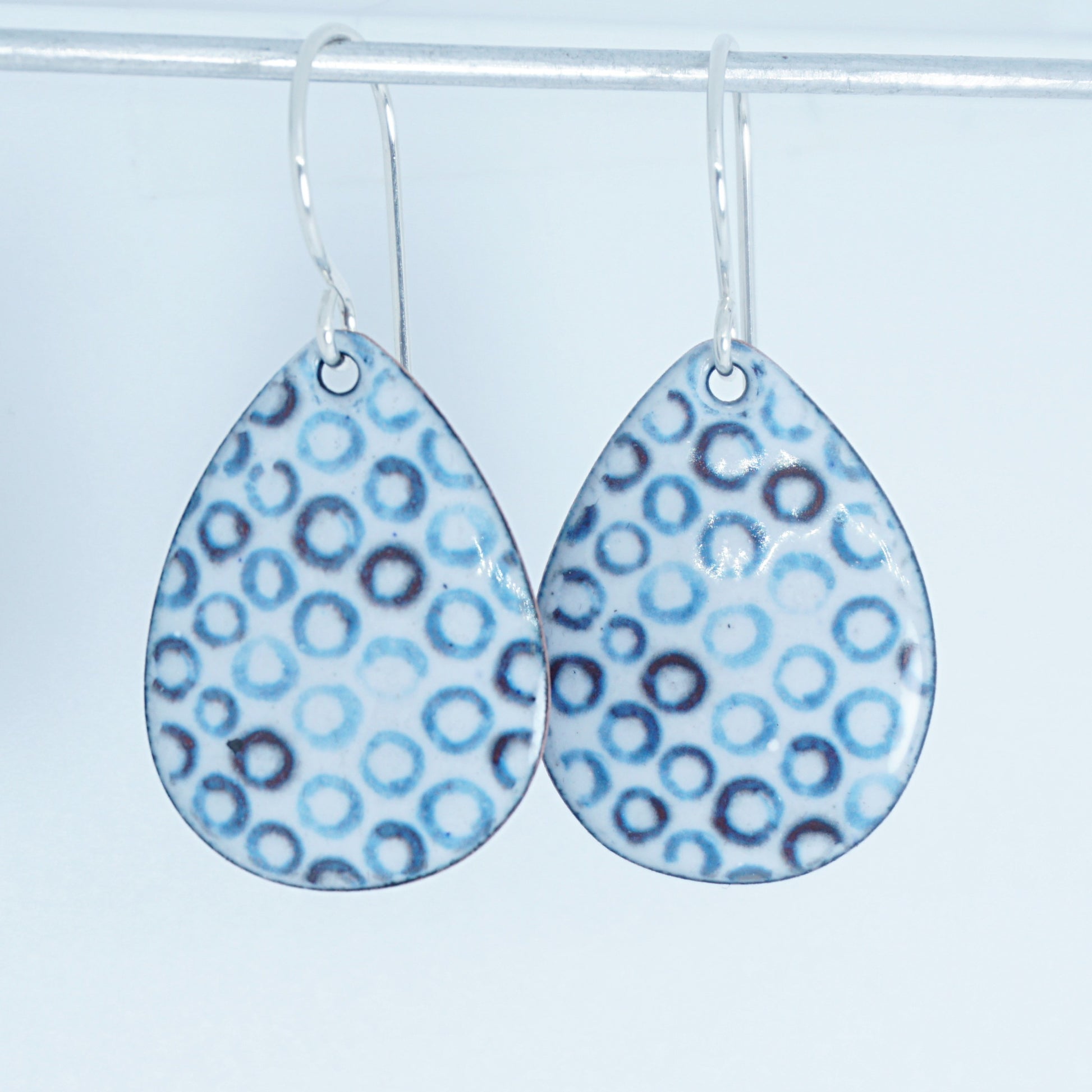 To create these earrings, I hand cut and dome the copper blanks. I then fire lead free vitreous enamel in a kiln to over 1500°. The flower design is achieved using kiln fired enamel decals. Multiple layers, techniques, and firings are necessary to achieve the look of these earrings.