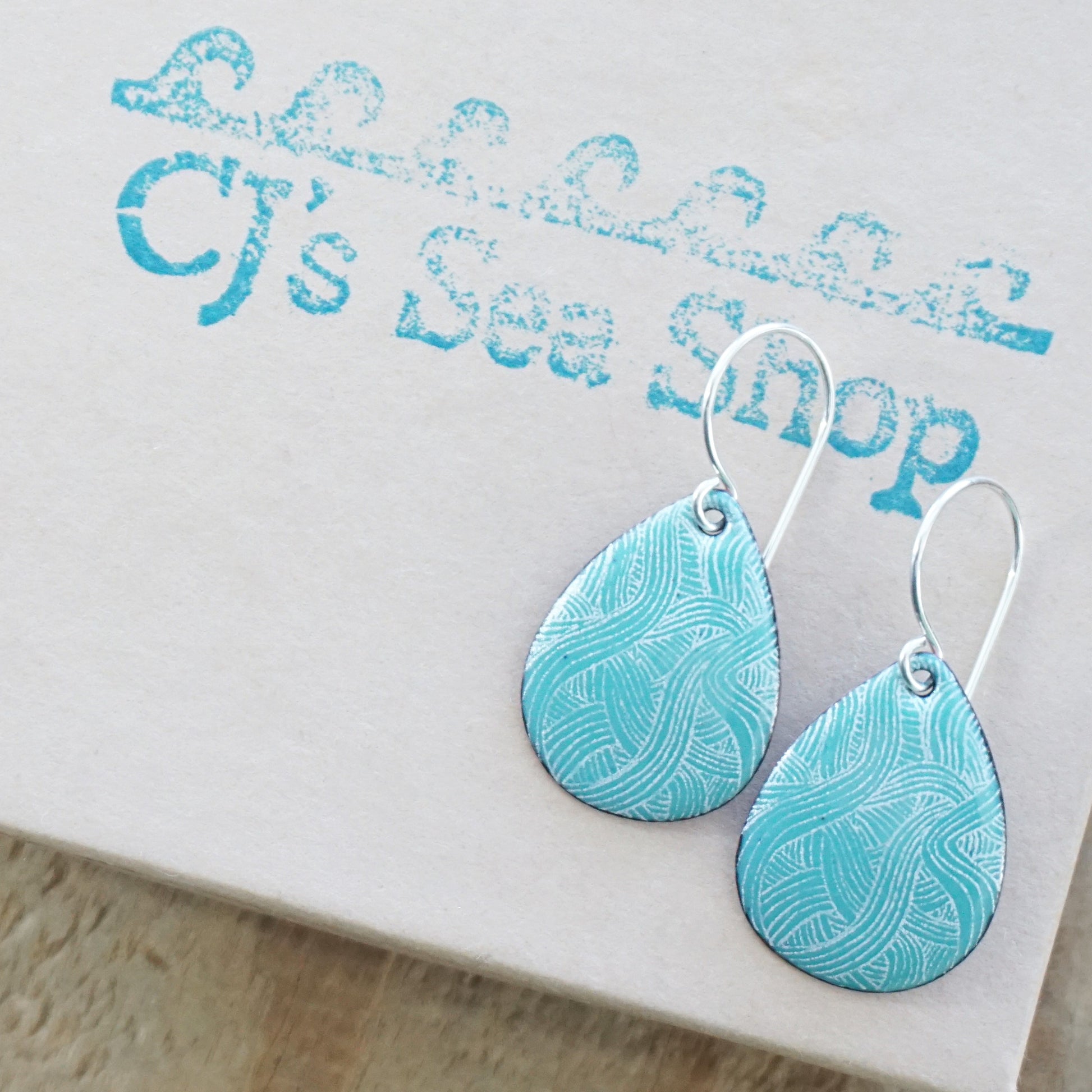 To create these earrings, I hand cut and dome the copper blanks. I then fire lead free vitreous enamel in a kiln to over 1500°. The design is achieved using kiln fired enamel decals. Multiple layers, techniques, and firings are necessary to achieve the look of these earrings.