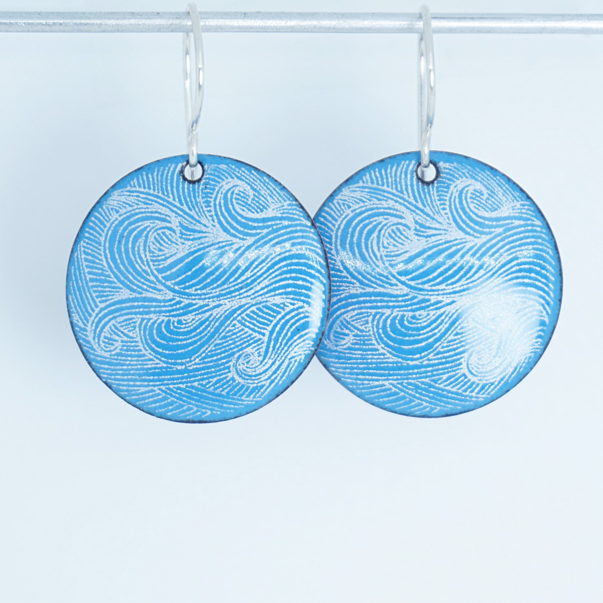 White Wave Accents on Aqua Blue Enamel Disc Earrings