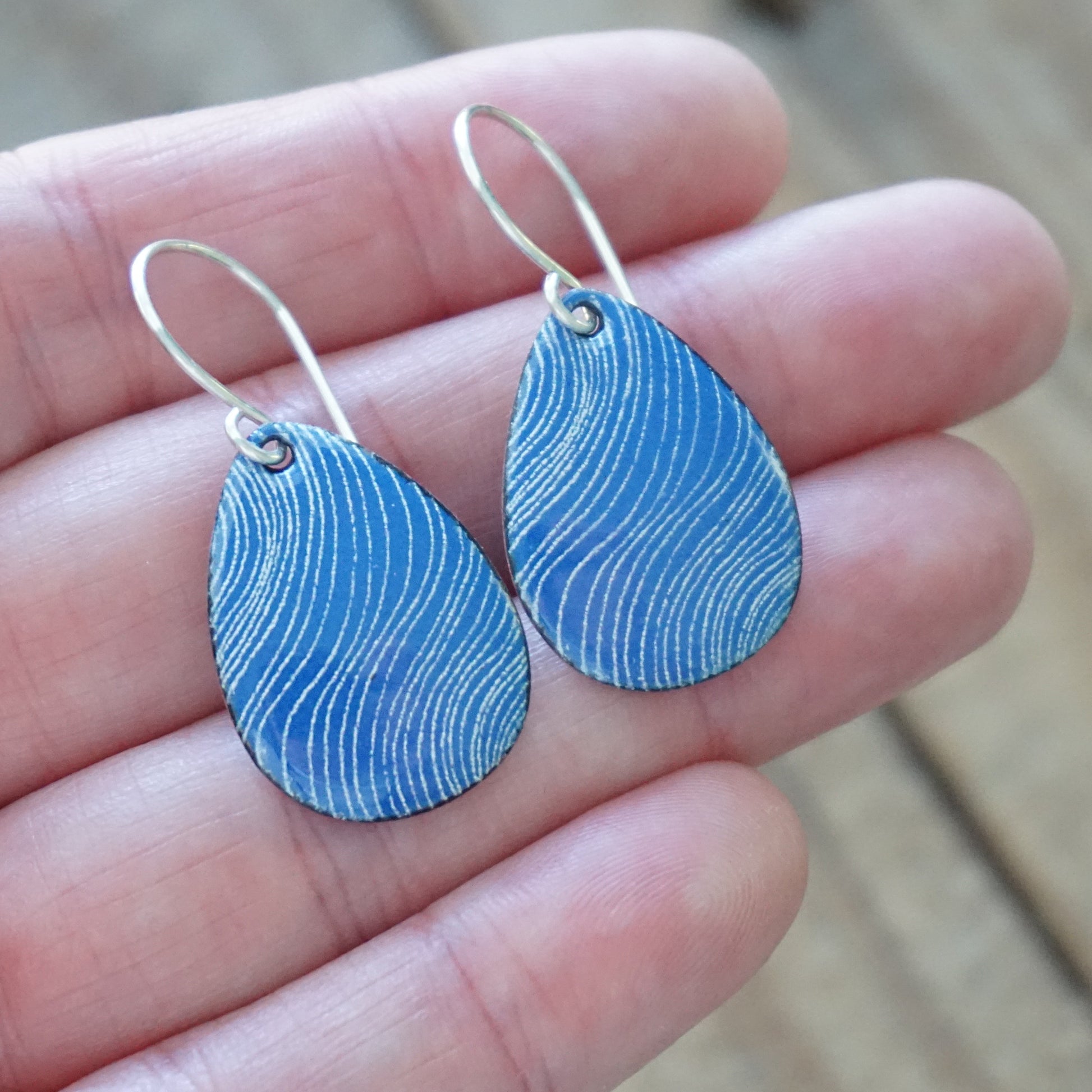White wavy line accents on cobalt blue enamel teardrop earrings.